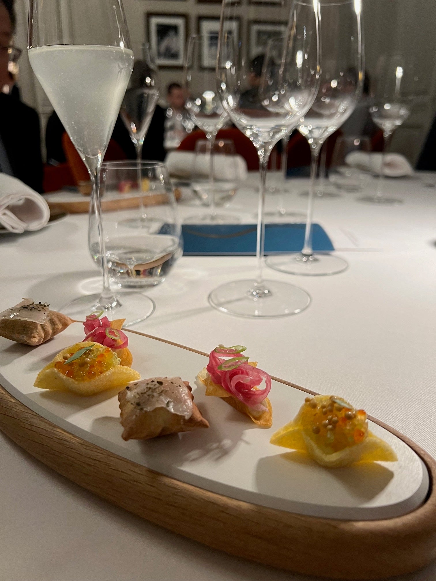 一皿ごとに、ソムリエたちは、種類の異なる日本酒を紹介し、それぞれの料理との相性の良さを説明しました。日本酒づくりに欠かせない水の重要性について、日本の軟水はピュアな感覚と豊かな口当たりを与えてくれること。また、日本酒が、ワインとの相性があまり良くない食材にも適しているということにも触れました。その理由として、食材とぶつかりにくく、食材の風味に優しく重なるうえに日本酒には天然のアミノ酸が多く含まれているため、卵や魚のような旨味の多い食材と響き合うという説明がありました。
