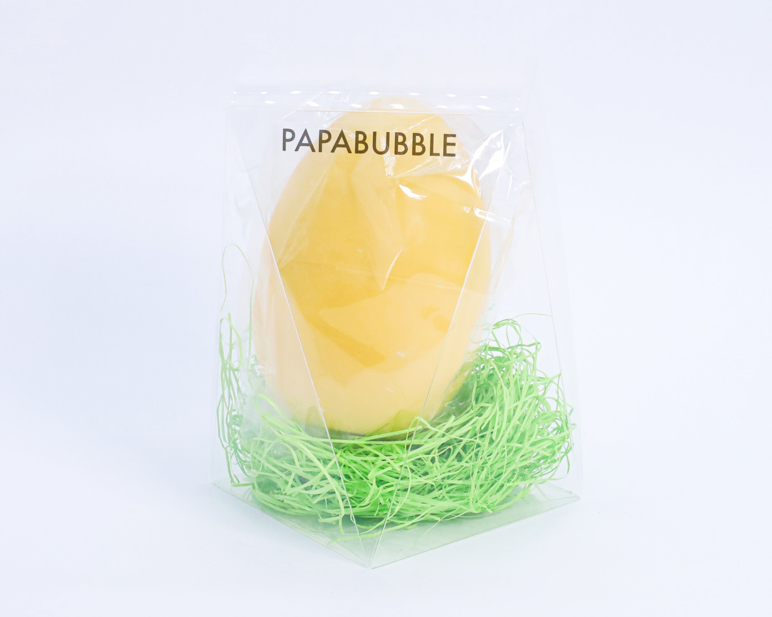 たまごの殻をかぶった愛らしいひよこや「HAPPY EASTER」の文字が入った、春を感じさせるパステルカラーのキャンディを詰め込んだ限定ミックスです。ヨーグルトやパインなど爽やかな酸味のフレーバーに加え、パパブブレでは珍しい、こっくり甘いプリンフレーバーを揃えました。パパブブレにとって初挑戦となった楕円形のキャンディは、難易度の高い形状を職人の手で卵形に再現した、イースターらしさ満載の商品です。