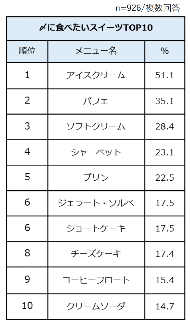 ※提示した選択肢:パフェ、アイスクリーム、ソフトクリーム、シャーベット、ジェラート・ソルベ、フルーツタルト、ショートケーキ、チョコレートケーキ、チーズケーキ、バスクチーズケーキ、ミルクレープ、ミルフィーユ、モンブラン、シュークリーム・エクレア、パンケーキ、パウンドケーキ、バウムクーヘン、アップルパイ、ティラミス、カヌレ、マカロン、フィナンシェ、プリン、マンゴープリン、パンナコッタ、カタラーナ、ドーナツ、エッグタルト、チョコレート、お団子、どら焼き、おしるこ・ぜんざい・あんみつなど、かき氷、カステラ、焼き芋、クリームソーダ、コーヒーフロート、その他(自由回答)、甘いものは食べない