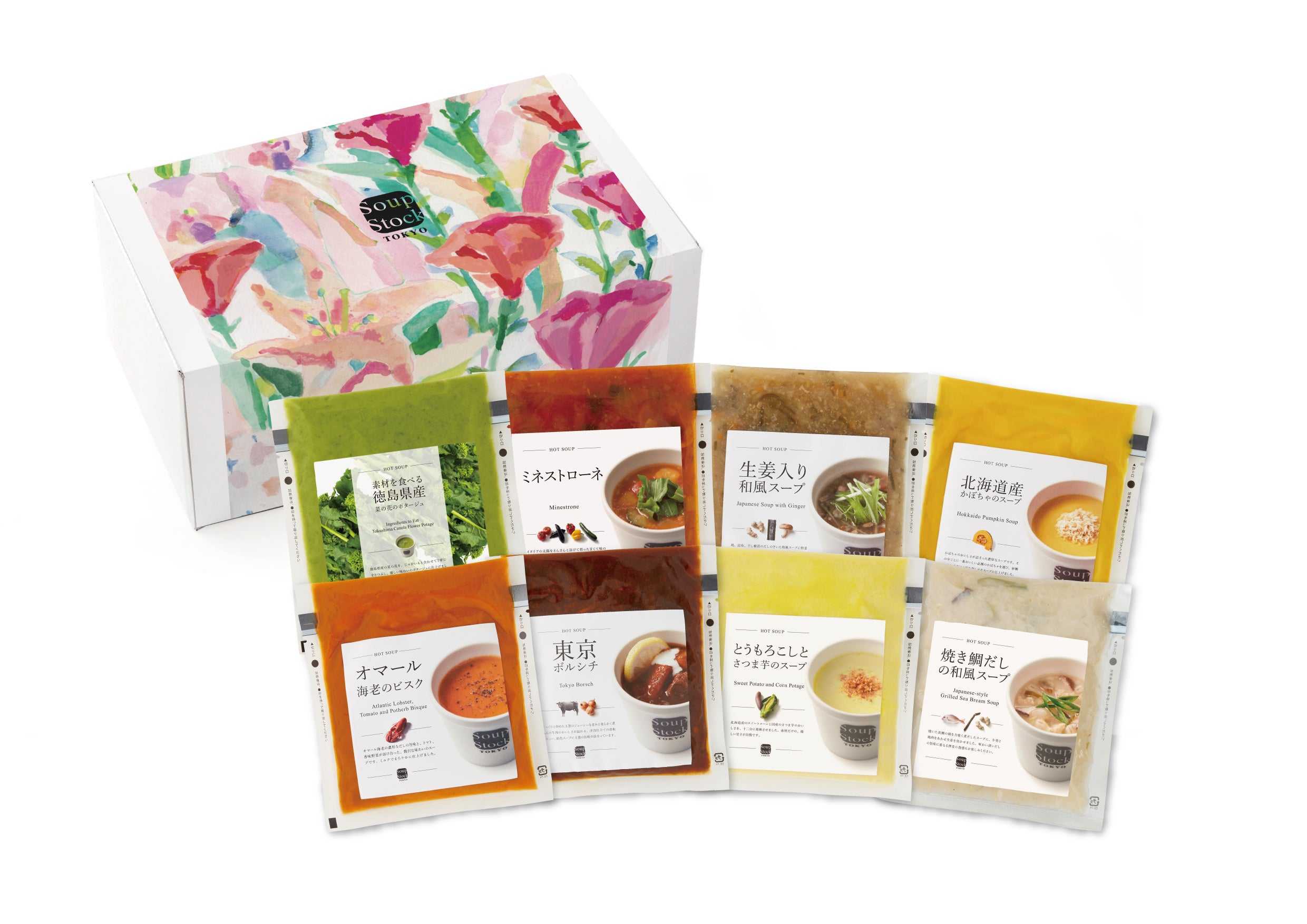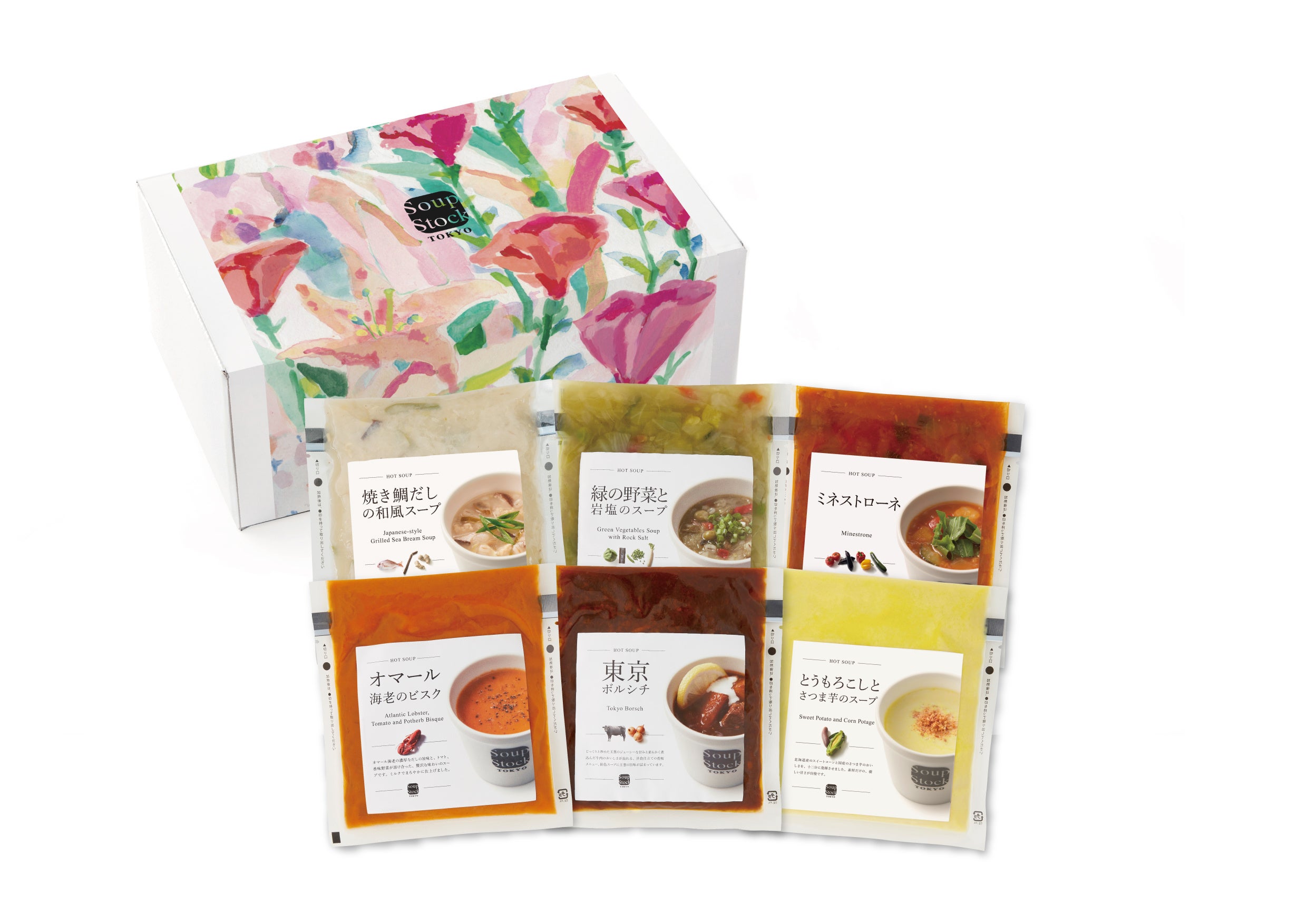 今年の母の日ギフトには、看板商品の「オマール海老のビスク」「東京ボルシチ」、野菜の自然な甘みが人気の「とうもろこしとさつま芋のポタージュ」のほか、牛蒡と押麦の食感が楽しい「焼き鯛だしの和風スープ」やベジタリアンスープの「ミネストローネ」などを組み合わせ、健康を気づかう気持ちも伝わるようなスープのセットをご用意いたしました。