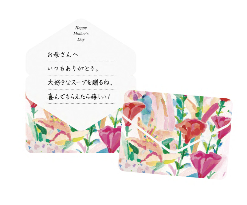 遠くにいても近くにいても、いつも見守ってくれるお母さん。 普段は気恥ずかしくて言えない「ありがとう」の気持ちや日常では伝えにくい想いを、 スープの贈りものに込めるのはいかがでしょうか。忙しい日々の中で、一品料理する時間を、ゆっくり食事をしたりふと休憩したりするひとときにしていただけますように。