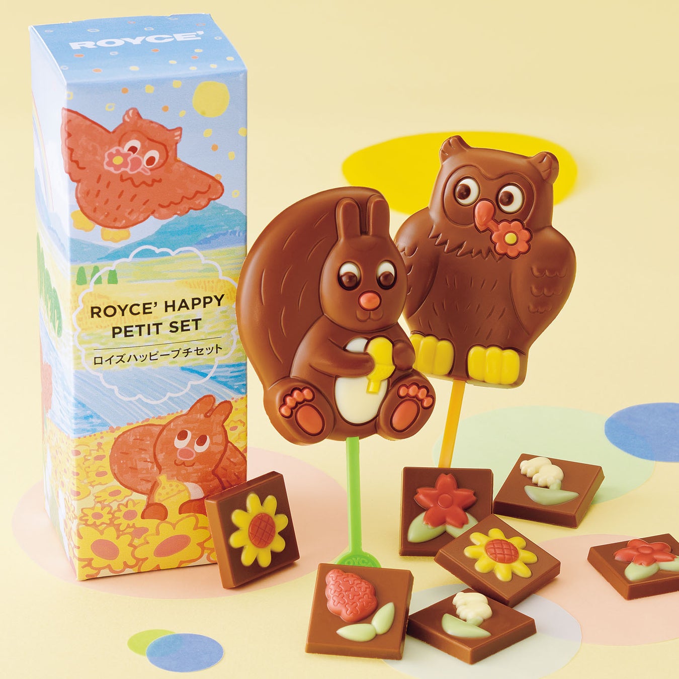 北海道・新千歳空港にあるロイズ チョコレートワールドで人気の、フクロウとリスのロイズポップチョコと、色とりどりのロイズフラワーチョコを、動物たちが描かれたかわいらしいパッケージに詰め合わせました。