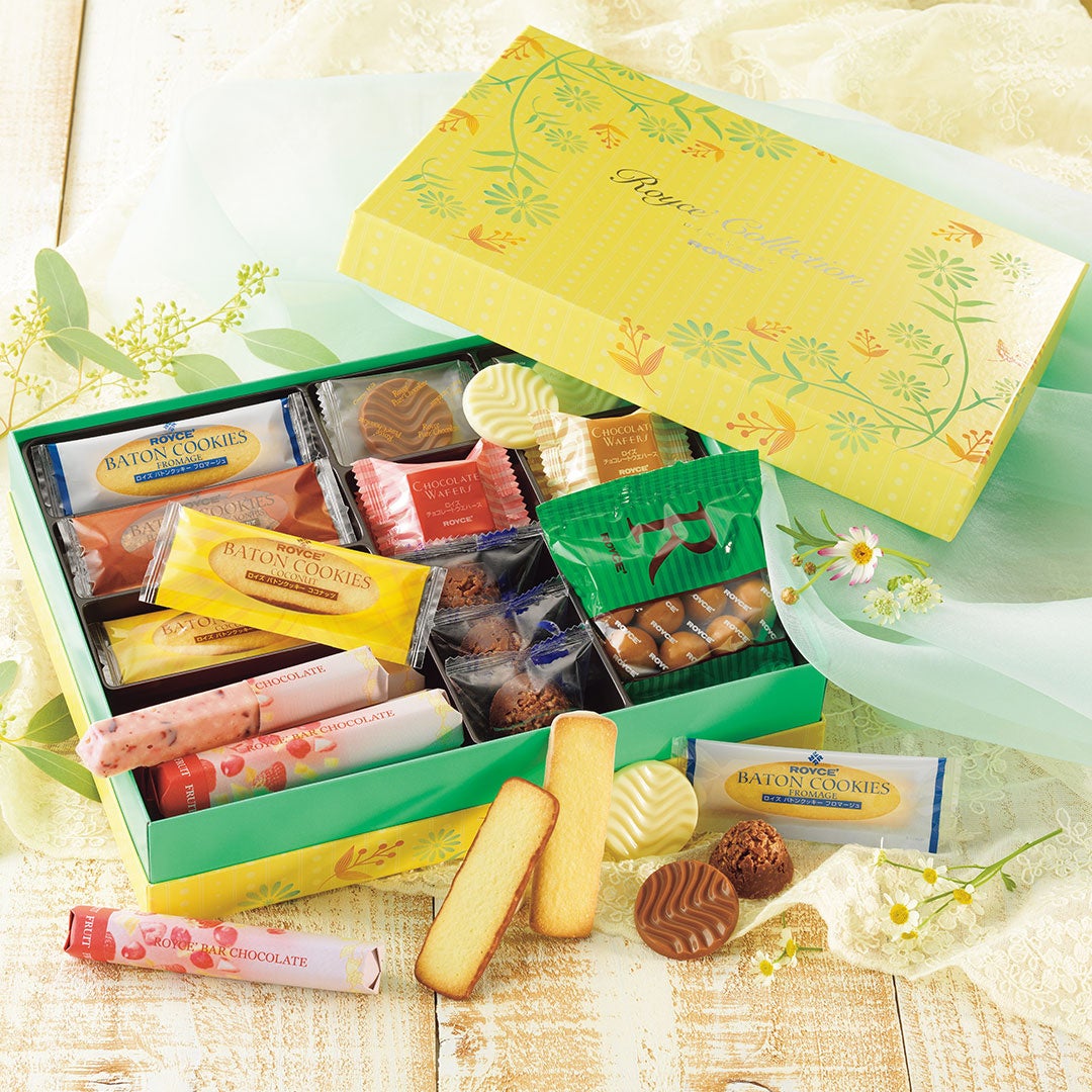 陽だまりに咲くお花をイメージした温かみのある雰囲気のボックスに、バトンクッキーやフルーツバーチョコレートをはじめ、ロイズの人気商品を10種類計66個と、バリエーション豊富に詰め合わせました。