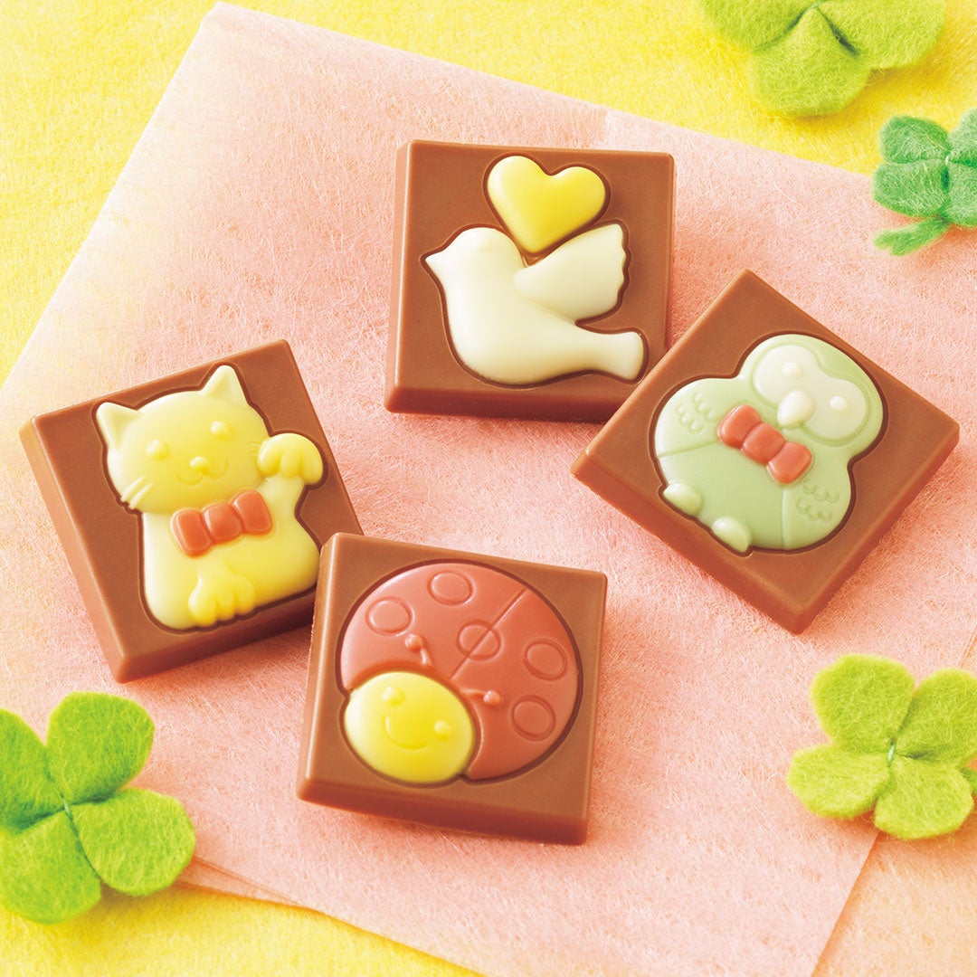 幸運の象徴とされる4つの生き物やアイテムをモチーフにしたひと口サイズのチョコレート。ストロベリー風味のクリームをまろやかなミルクチョコレートで包み、フクロウ・てんとうむし・ハト・招き猫の4種類をデザインしました。