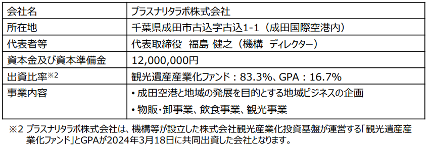 株式会社地域経済活性化支援機構(以下「機構」という。)、株式会社グリーンポート・エージェンシー(以下「GPA」という。)は、このたび、DMC※1 「プラスナリタラボ株式会社」を設立し、成田国際空港株式会社のサポートのもと2024年4月1日より順次、成田空港周辺地域産品を活用した物販・卸事業、飲食事業、観光事業を推進してまいります。