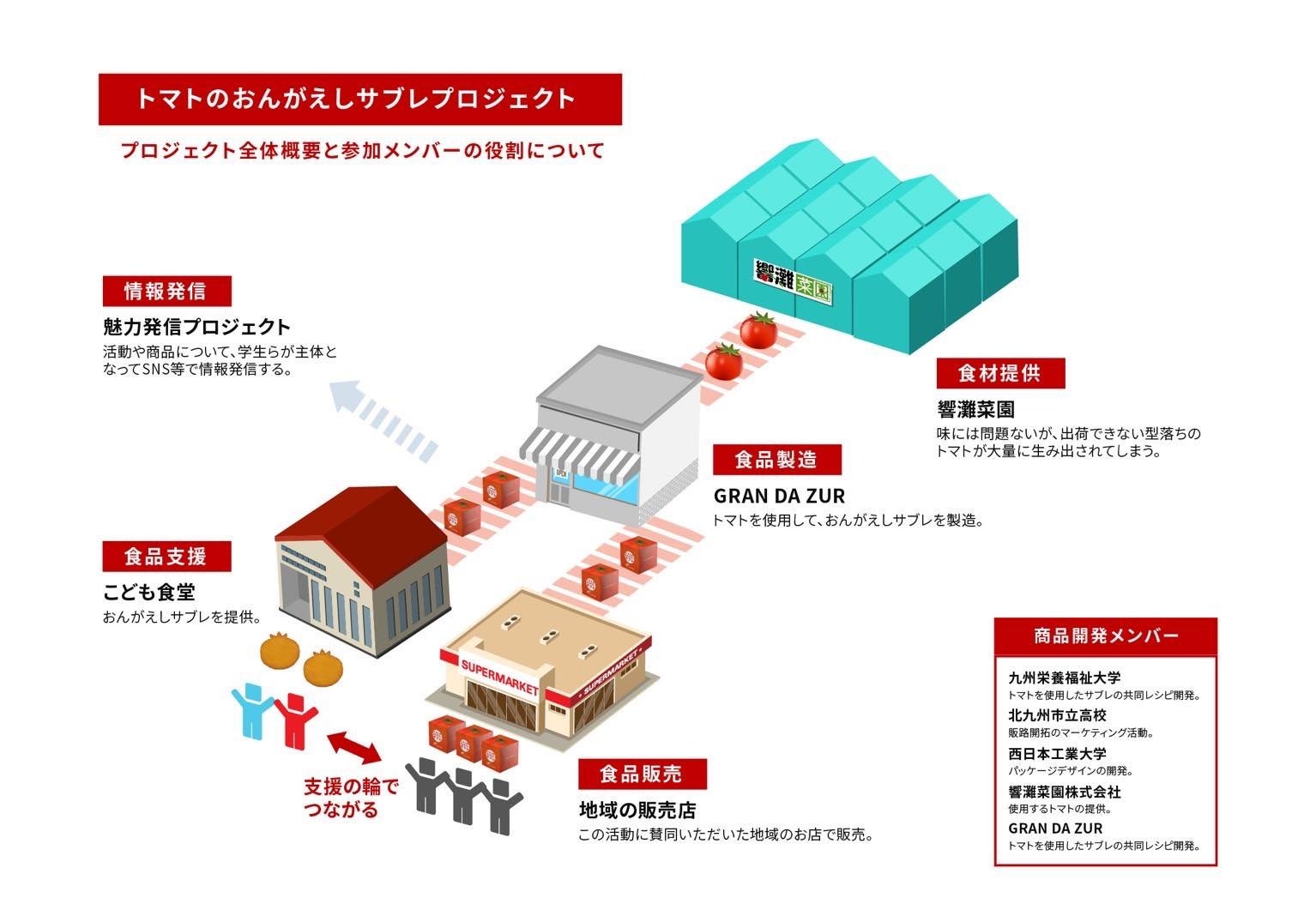 この度、同プロジェクトの第二弾商品として、「トマトのおんがえしサブレ」を開発しました。サブレ5枚につき トマト1.5個分使用。お子様の噛む力を育てるカリカリした食感です。本品は3月14日より、地元の菓子メーカーであり、本品の製造を担う「GRAN DA ZUR(グランダジュール)」の店舗及び本プロジェクトの活動にご賛同いただいた小売店にて販売しております。なお、売上の一部は、北九州市の子ども食堂に寄付します。