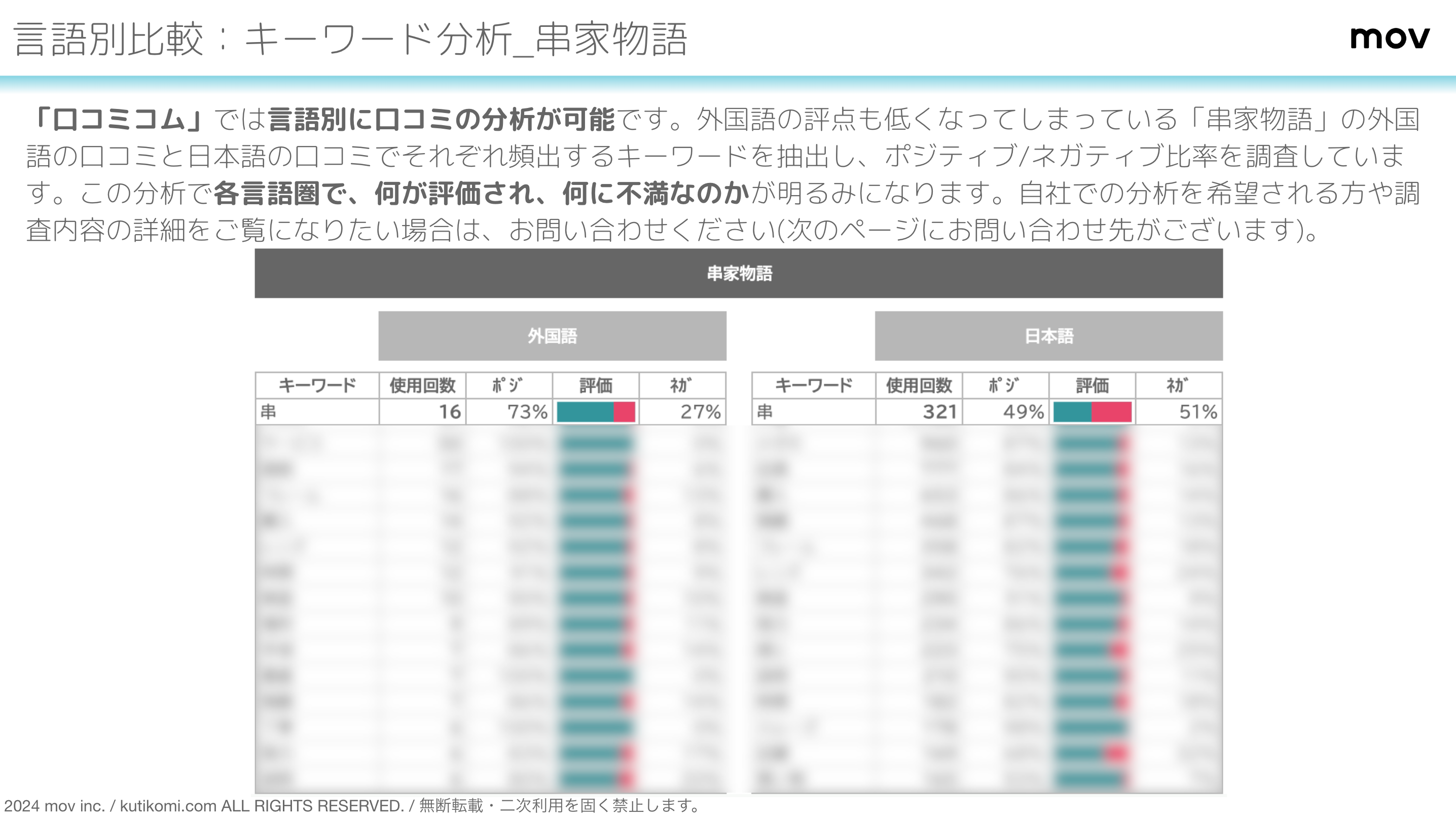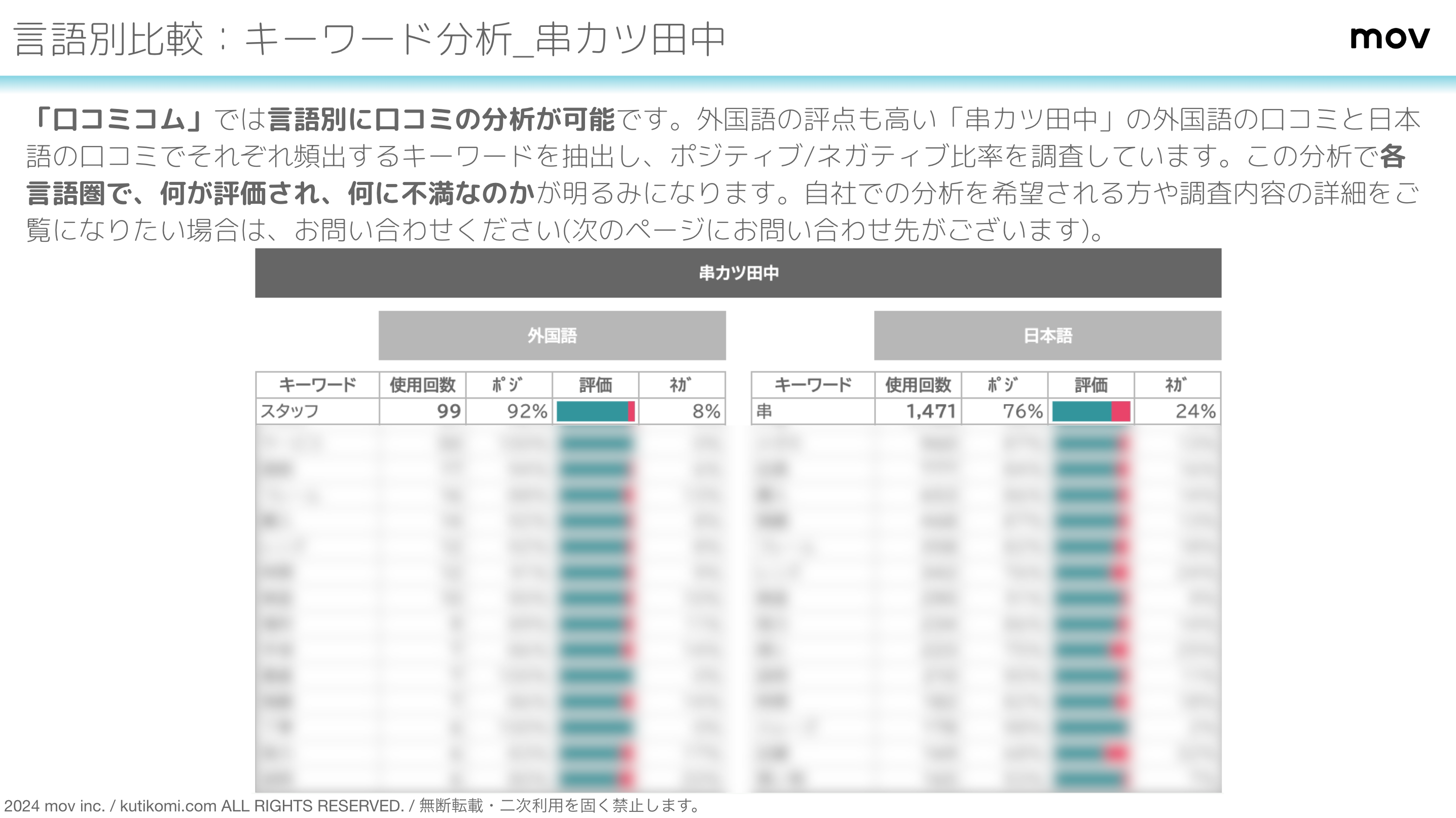 外国語の評価が低い「串家物語」や外国語の評点も高い「串カツ田中」の外国語の口コミと日本語の口コミでそれぞれ頻出するキーワードを抽出し、ポジティブ/ネガティブ比率を調査しています。
