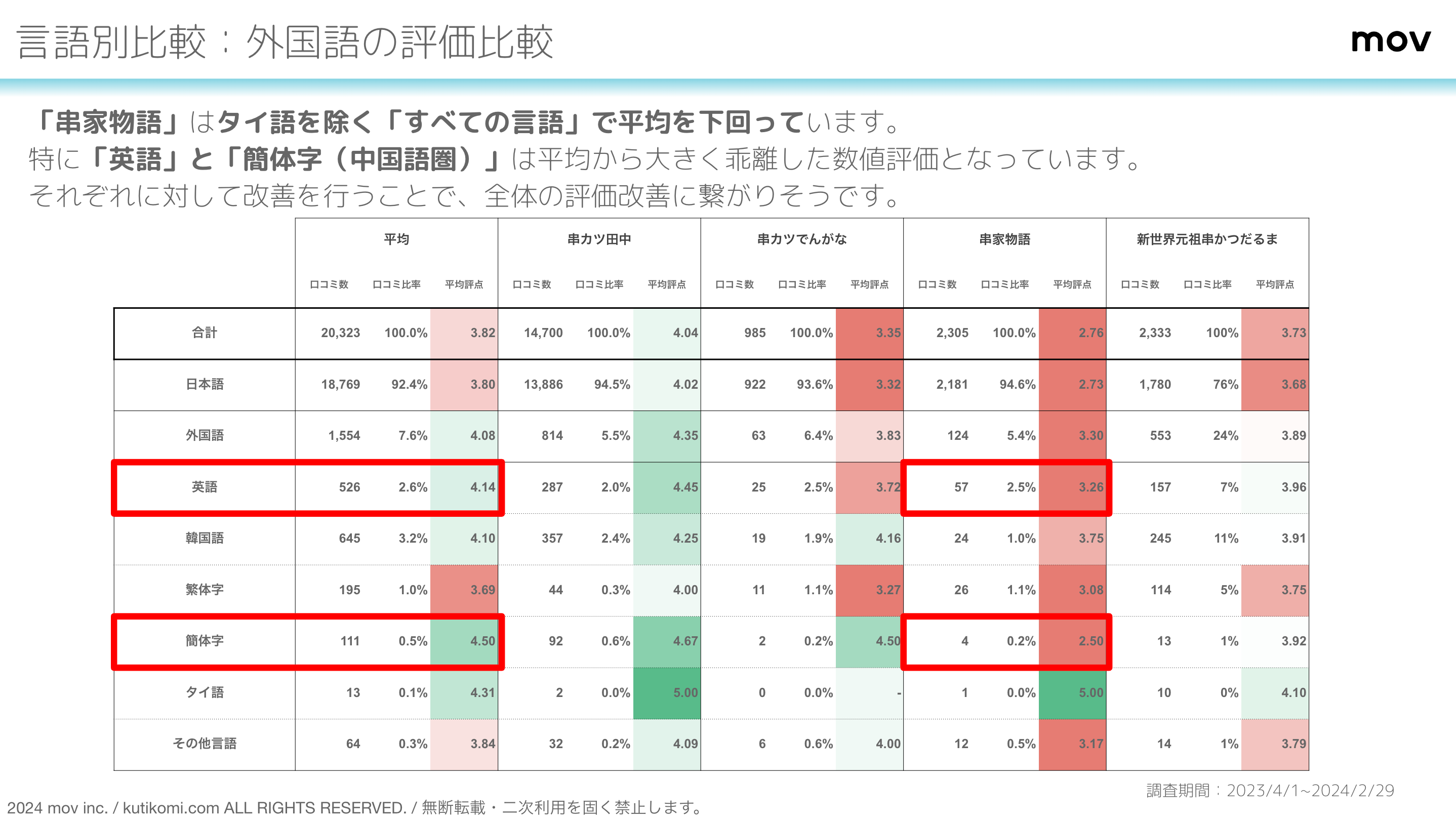 「串家物語」はタイ語を除く「すべての言語」で平均を下回っており、特に「英語」と「簡体字(中国語圏)」は平均から大きく乖離した数値評価となっています。