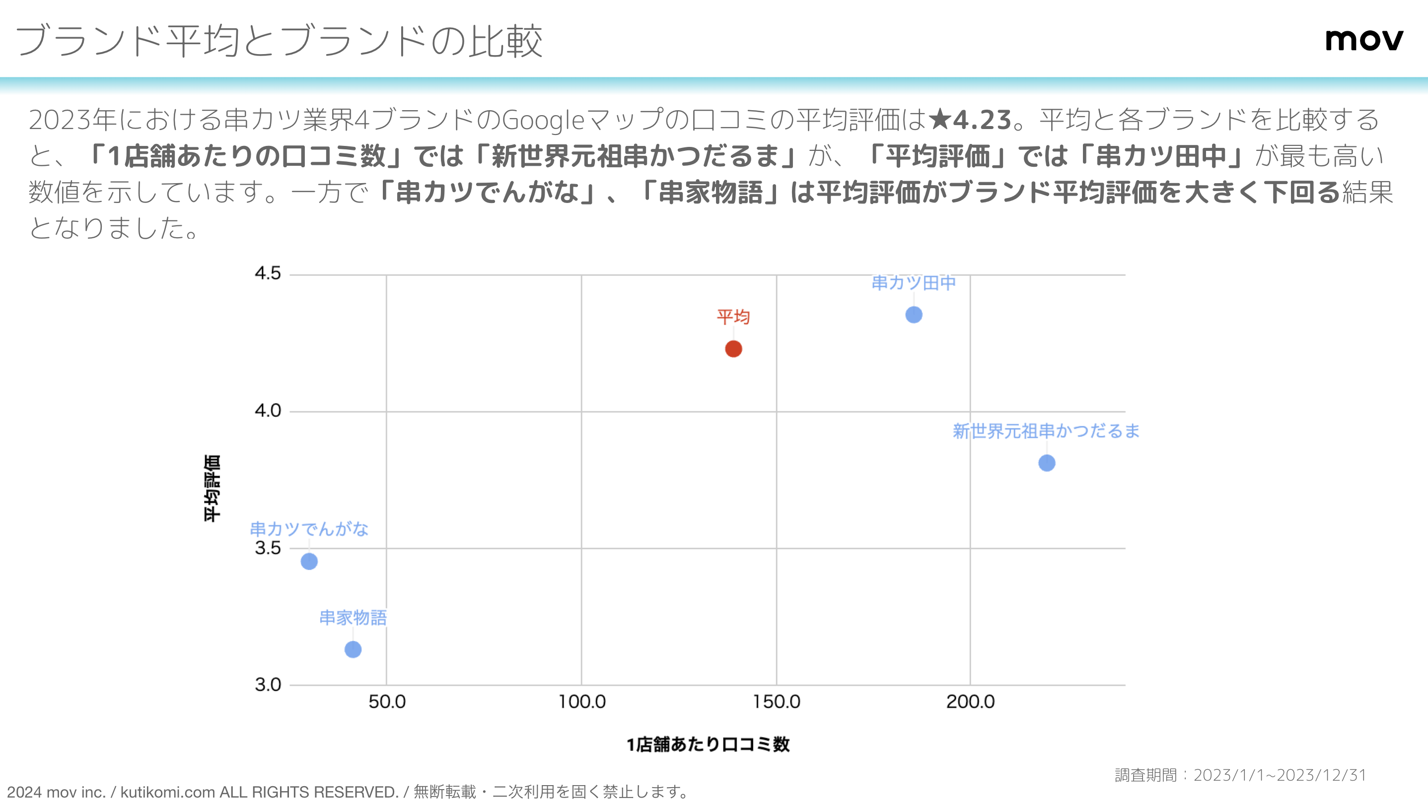 一方で「串カツでんがな」、「串家物語」は平均評価がブランド平均評価を大きく下回る結果となりました。