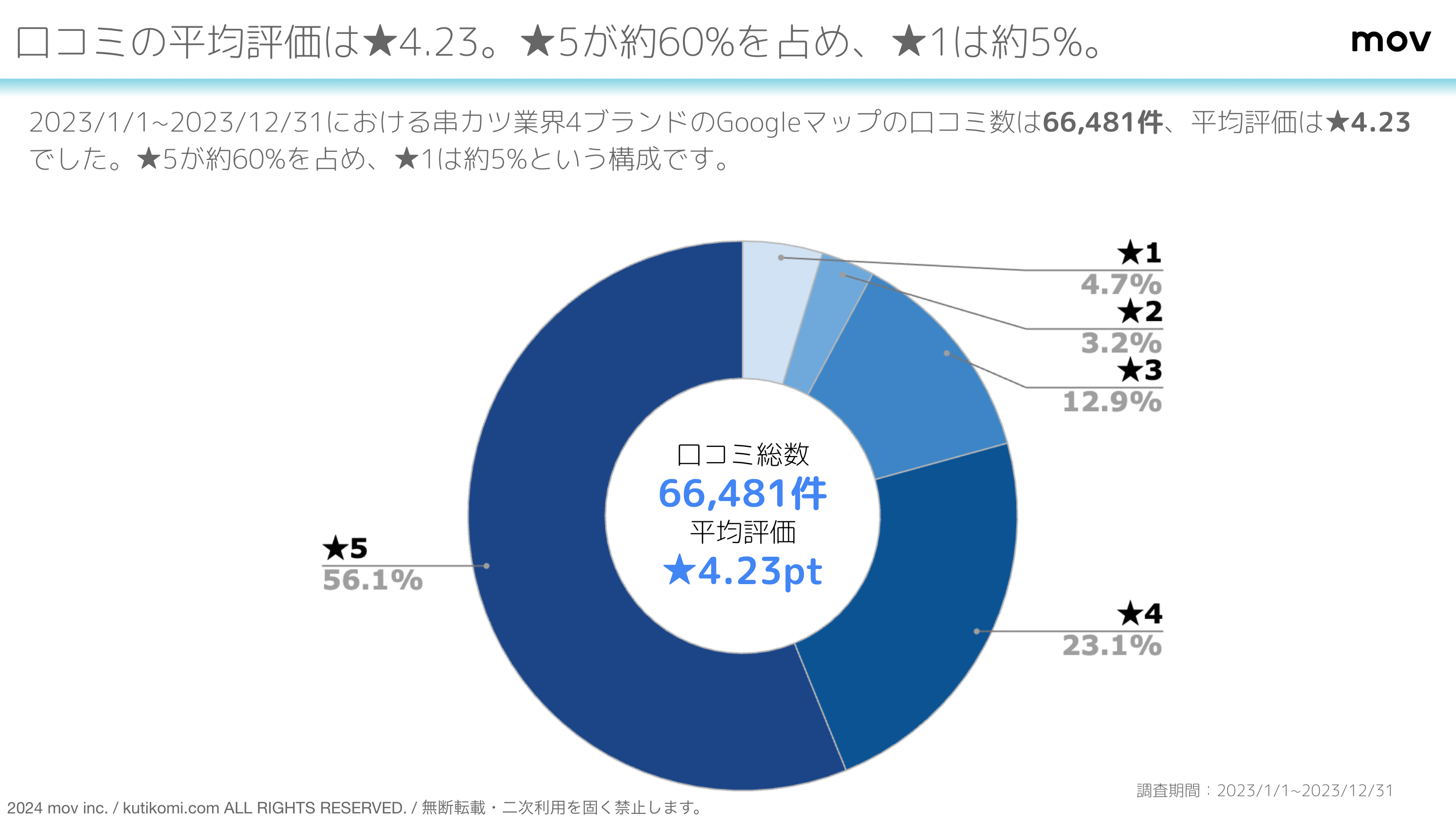 調査対象期間における串カツ業界4ブランドのGoogleマップの口コミ数は66,481件、平均評価は★4.23でした。★5が約60%を占め、★1は約5%という構成です。