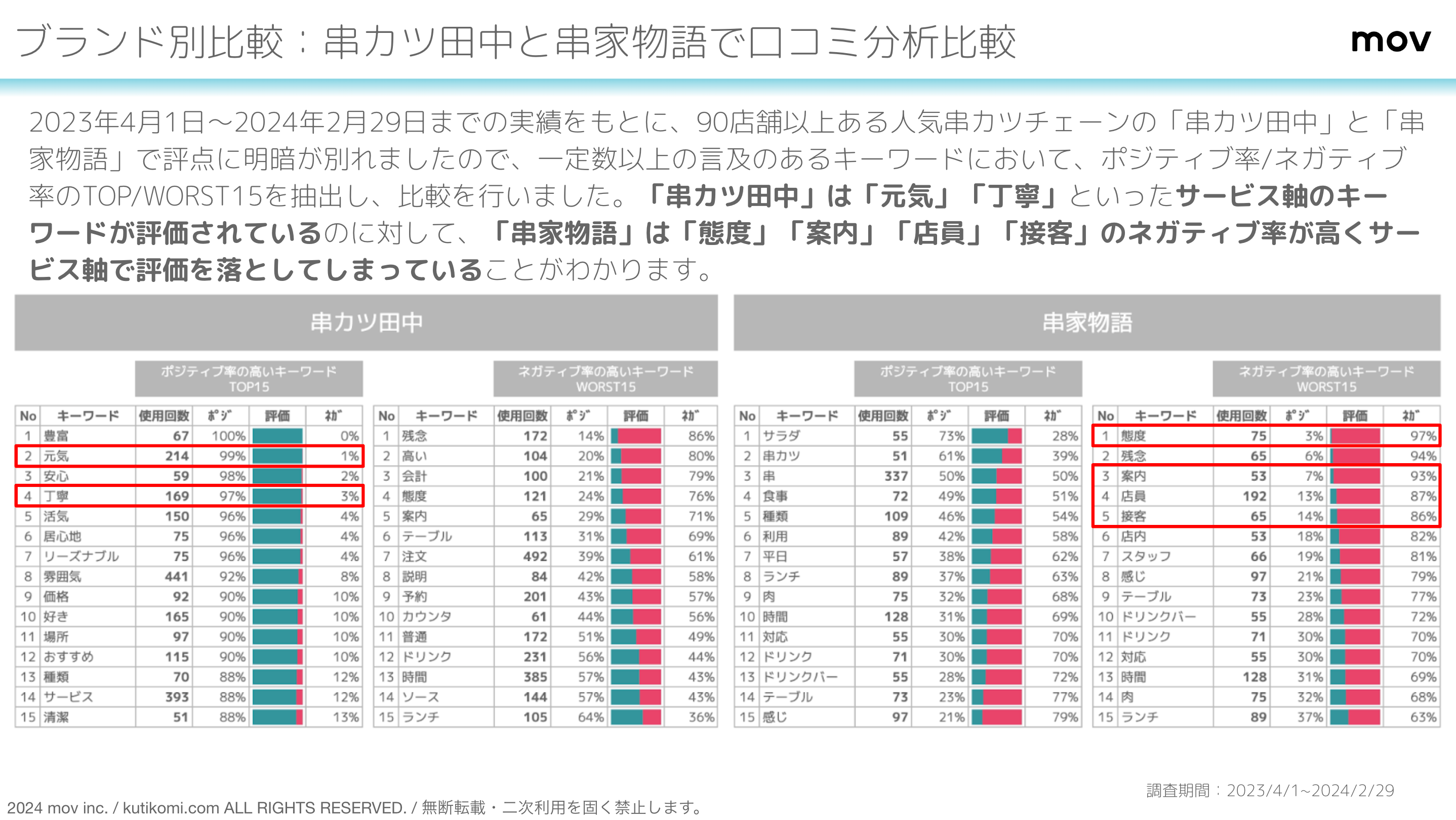 ・「串カツ田中」と「串家物語」での口コミ分析比較結果