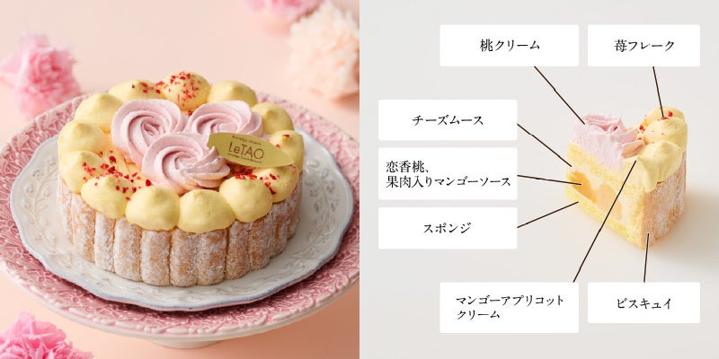 ミルキーなチーズムースの中に恋香桃とマンゴーソースを入れ、みずみずしさと華やかな甘さを、ふんわりとしたビスキュイで包みました。