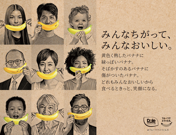 Doleでは昨年7月、フルーツであなたの暮らしを笑顔にしていきたいという思いを込めて日本オリジナルとなる「フルーツでスマイルを。」という新ブランドメッセージを策定し、これに合わせ、どんなバナナでも美味しく食べて笑顔になってほしいという願いから新ビジュアルを作成いたしました。