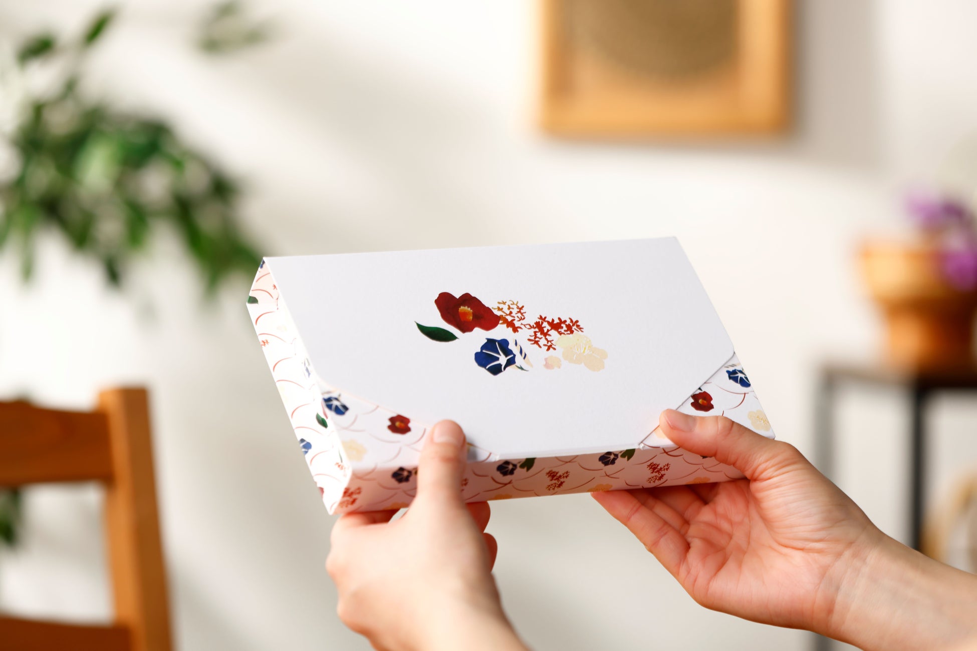 また、ギフトに相応しいパッケージとして質感の高い折り箱に四季の花をあしらった外装を用意しました。紙袋に入れずそのまま手渡ししやすい上質なデザインがポイントです。
