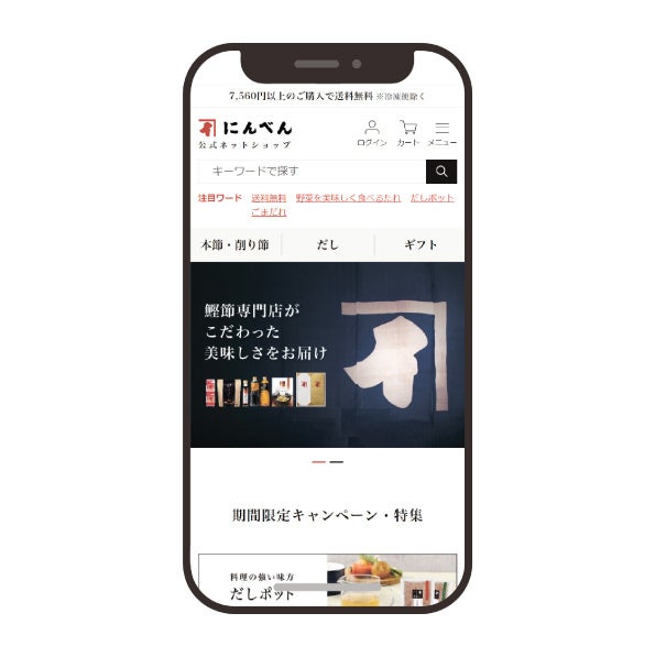 「にんべんネットショップ」は、2010年より自社運営のECショップとしてオープンし、広く全国のお客様に鰹節やだしの価値を生かした商品を提案、提供しています。通販限定デザインの「だしポット」やフレッシュパック「本枯鰹節物語」など、本枯鰹節関連の商品が人気です。