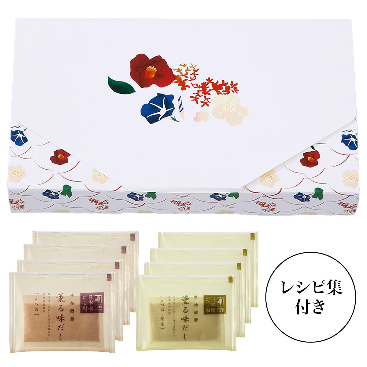 選び抜いた高品質な原材料だけを使い、素材になるべく熱をかけない乾燥法を採用し、だし本来の味と香りを極めた味付きだしパック「本枯鰹節 薫る味だし」がプチギフトになって登場しました。一つ一つに不活性ガスを充てんした個包装にすることで酸化を抑え、香味品質を保ちます。梅、朝顔、金木犀、椿の彩り豊かな季節の花のイラストを添えたギフトボックスで、気軽なプレゼントや手土産におすすめです。