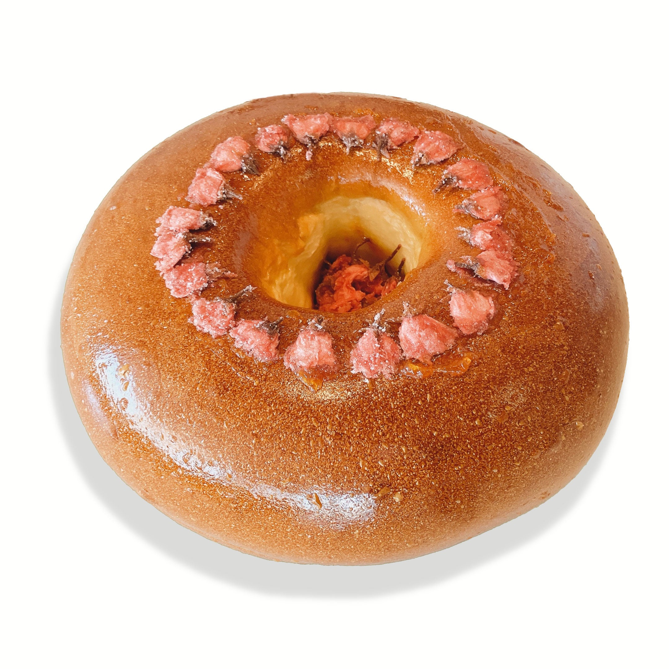 天皇両陛下が東京の向島にある水戸藩の下屋敷でお花見をする際、日本を象徴する国花で、 季節感を表現できる「桜」に目を向け、当時奈良の吉野山から、 八重桜の花びらの塩漬けを取り寄せ、 あんぱんに埋め込みました。