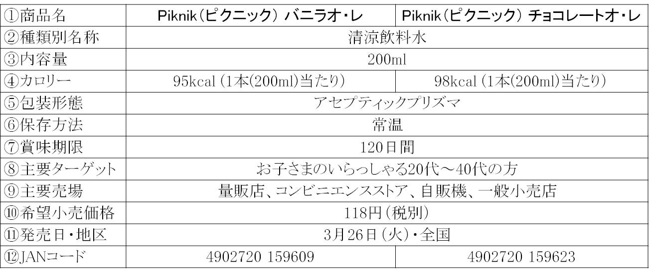 このたび発売する「Piknik(ピクニック) バニラオ・レ」、「Piknik(ピクニック) チョコレートオ・レ」は、「Piknik(ピクニック)」シリーズの特長であるまろやかなミルクに、相性の良いバニラ風味、チョコレート風味を合わせたPiknik(ピクニック)史上初のフレーバーです。ミルク由来の甘さに、お子さまから大人まで幅広く愛されるバニラやチョコレートの王道のおいしさが加わった、どこかホッとする優しい味わいです。常温保存が可能なため、まとめ買いやストック、お出かけの際の持ち運びにも便利です。