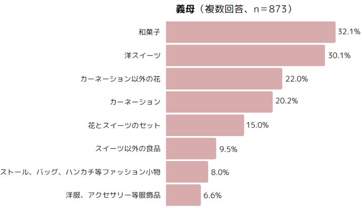 ・贈る予定のものは、実母・義母ともに、1位「和菓子」、2位「洋スイーツ」、3位「カーネーション以外の花」。(複数回答)