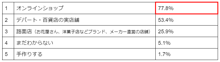 ・7割以上が「オンラインショップ」でのギフト購入を検討、次いで「デパート・百貨店の実店舗」。(複数回答)