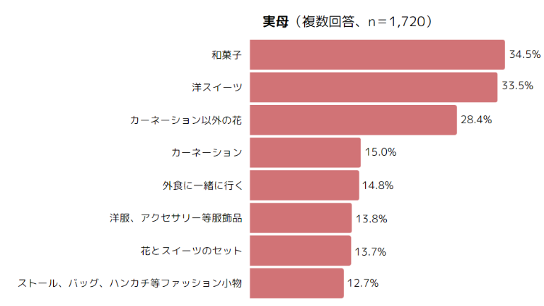 ・贈る予定のものは、実母・義母ともに、1位「和菓子」、2位「洋スイーツ」、3位「カーネーション以外の花」。(複数回答)