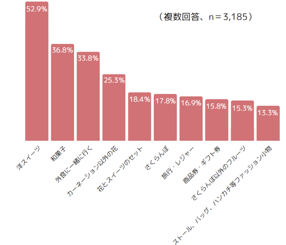 ・自分がもらって嬉しいものは、1位「洋スイーツ」、2位「和菓子」、3位「外食に一緒に行く」。定番の「カーネーション」は13位と、昨年に引き続き下位に。(複数回答)