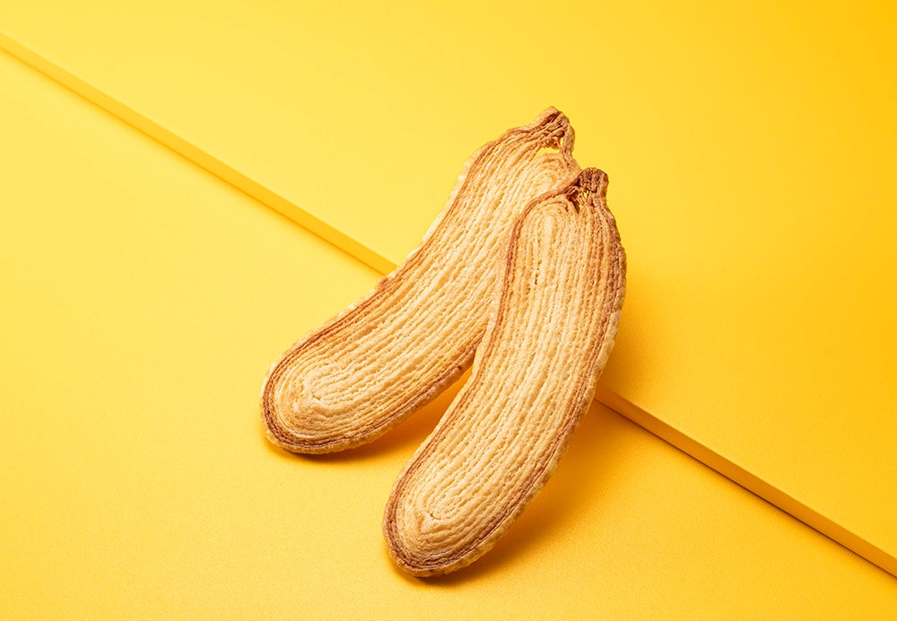 発酵バターをふんだんに使った風味豊かなパイ生地と、本物のバナナにしかないおいしさと香りをしっかり練り込んだクッキー生地を、何層にも折り重ねてさっくりと焼き上げました。パイのいのちとも言えるサクサクッと香ばしい食感にバターとバナナの香りが広がります。たっぷりと15枚入っていて個包装なので自分へのおやつや、お土産にもぴったりです。