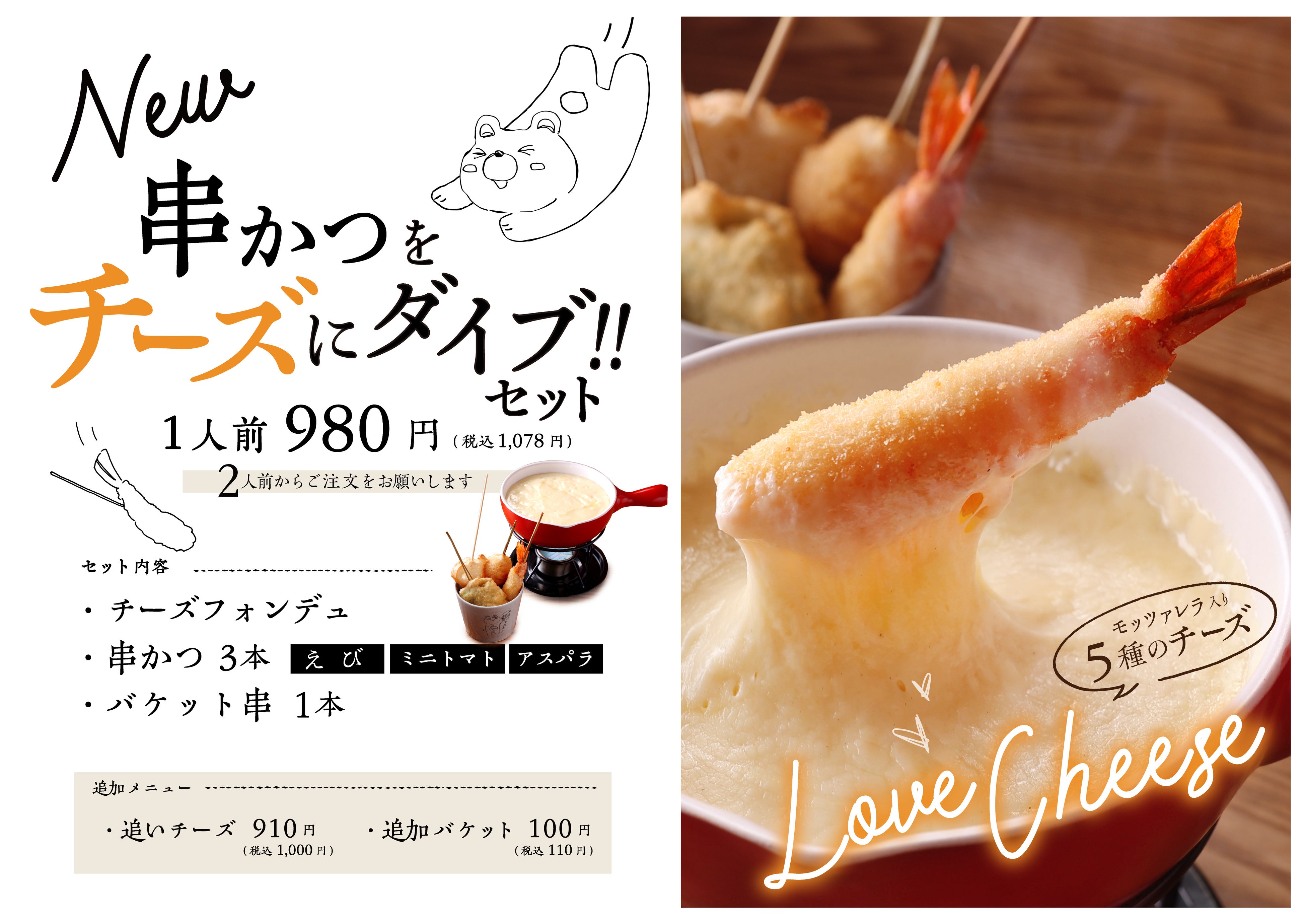 5種のチーズをブレンドした特製チーズフォンデュに串かつをダイブ!