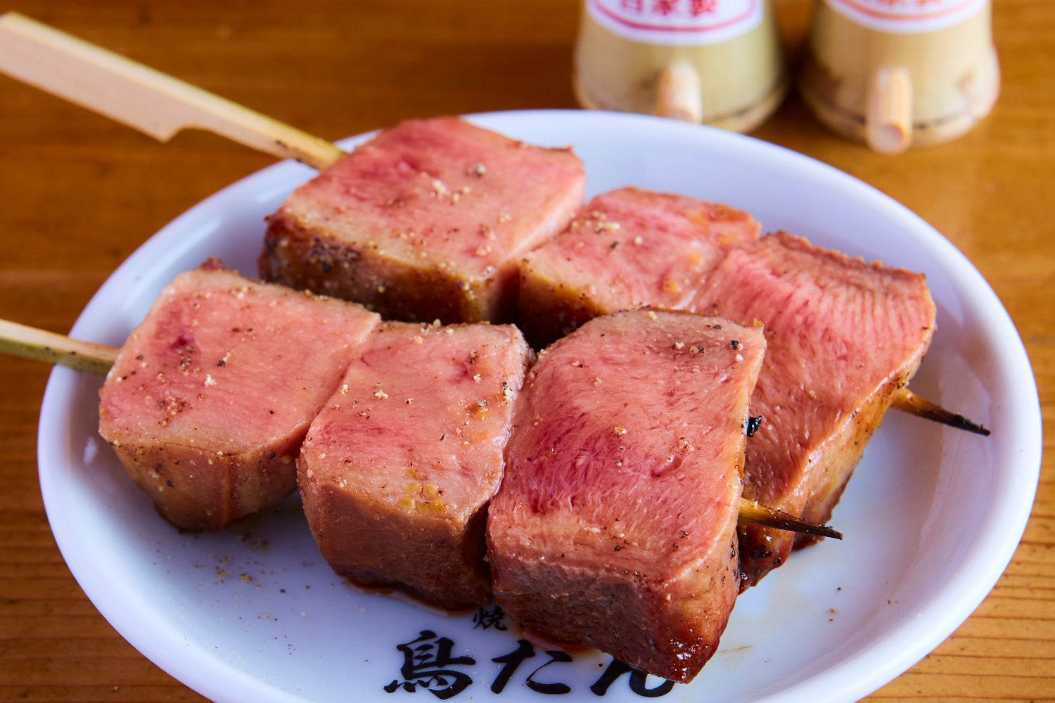 霜降りの上質部位のみを使用した鳥たん名物の牛タン串!