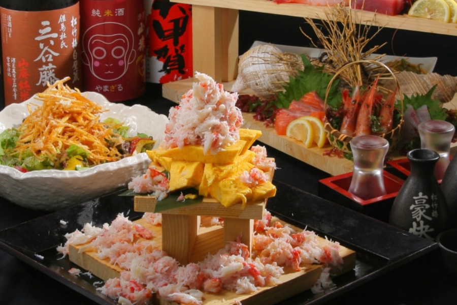 ご注文頂くと台に乗っただし巻き玉子が登場します。その上から掛け声と一緒に紅ズワイガニのほぐし身をお客様が「ストップ」と言うまでかけていきます。飲み会や宴会などでご注文頂くと大変盛り上がります。