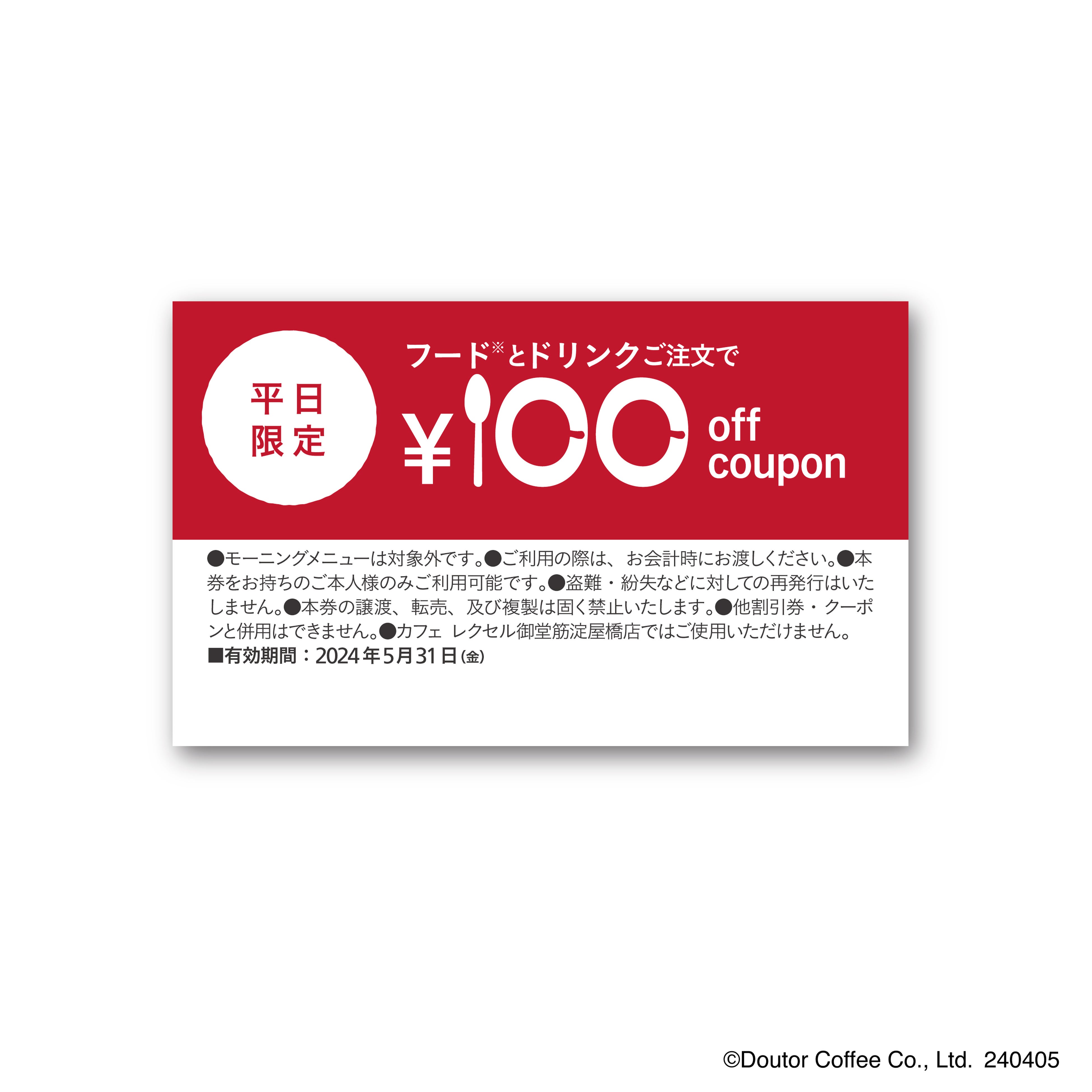 内容:次回ご来店時(平日限定)にフードとドリンクのセット注文で使える「¥100 offクーポン」を、店舗をご利用のお客様にプレゼント。