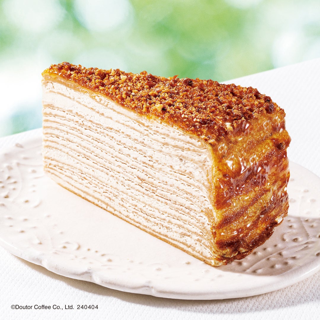 昨年好評いただいた「ブリュレ仕立ての黒糖ミルクレープ~沖縄県産黒糖使用~」が再登場。人気の定番商品「ミルクレープ」を黒糖風味にアレンジしました。黒糖風味のホイップクリームをサンドし、黒糖の風味とまろやかな味わいを楽しめる一品。天面には、グラニュー糖を振りかけて“ブリュレ”し、その上に砕いたかりんとうをトッピング。食感も楽しめる期間限定のミルクレープです。