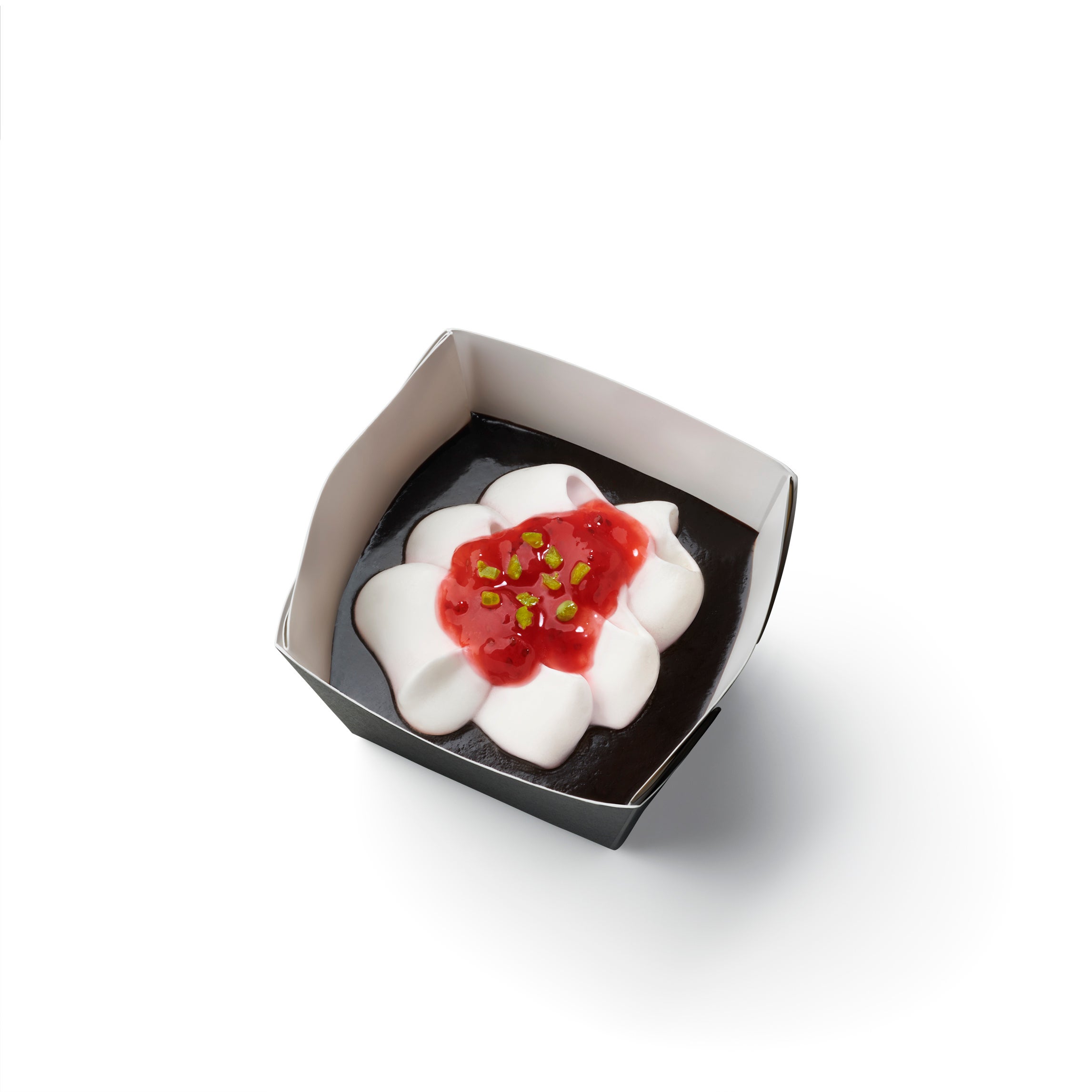 米粉やおからパウダー、甜菜糖などを使用したしっとりとしたココアスポンジを底に敷き、その上に豆乳加工品を使用したチョコ風味のムースを重ね、つやのあるグラサージュショコラ風のココア ソースで仕上げました。最後に豆乳ホイップクリームといちごのコンポート、ピスタチオをトッピングしています。チョコ風味のムースのやさしい甘さをベースに、いちごのコンポートの甘酸っぱさが全体を引き立てます。小麦粉・乳・卵を使用していないことを感じさせない濃厚な一品で、味わいも見た目も楽しめる、ティータイムにぴったりな商品です。