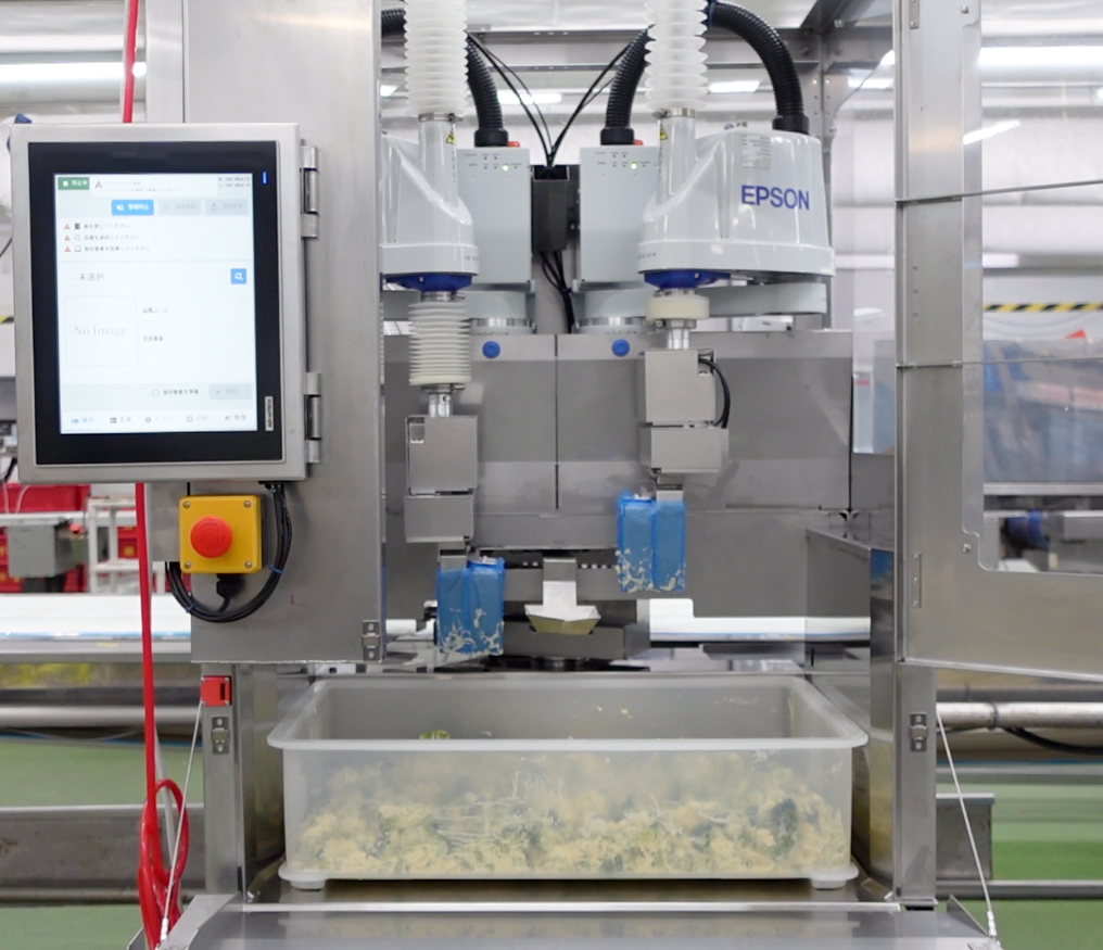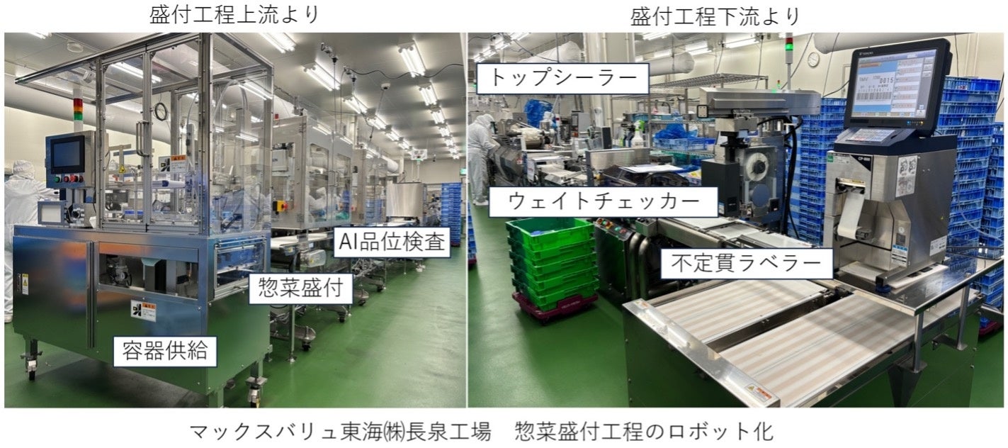 容器供給機に加えて、コネクテッドロボティクスの開発した盛付ロボットシステム「Delibot」、「AI検査ソフトウェア」を搭載した、AI品位検査装置を導入、スーパーマーケット業界では、先進的なガス置換型トップシーラー、自動計量ラベラー等を一連の統合ラインとして開発し、マックスバリュ東海株式会社の長泉工場の惣菜製造現場に導入しました。すでに「Delibot」を導入しているポテトサラダ・マカロニサラダなどの洋惣菜のラインに加えて、今回は新食材である、ひじき、ほうれん草の胡麻和え、ほうれん草の白和え、卯の花、などの和惣菜を扱う製造ラインをロボット化することに成功しました。