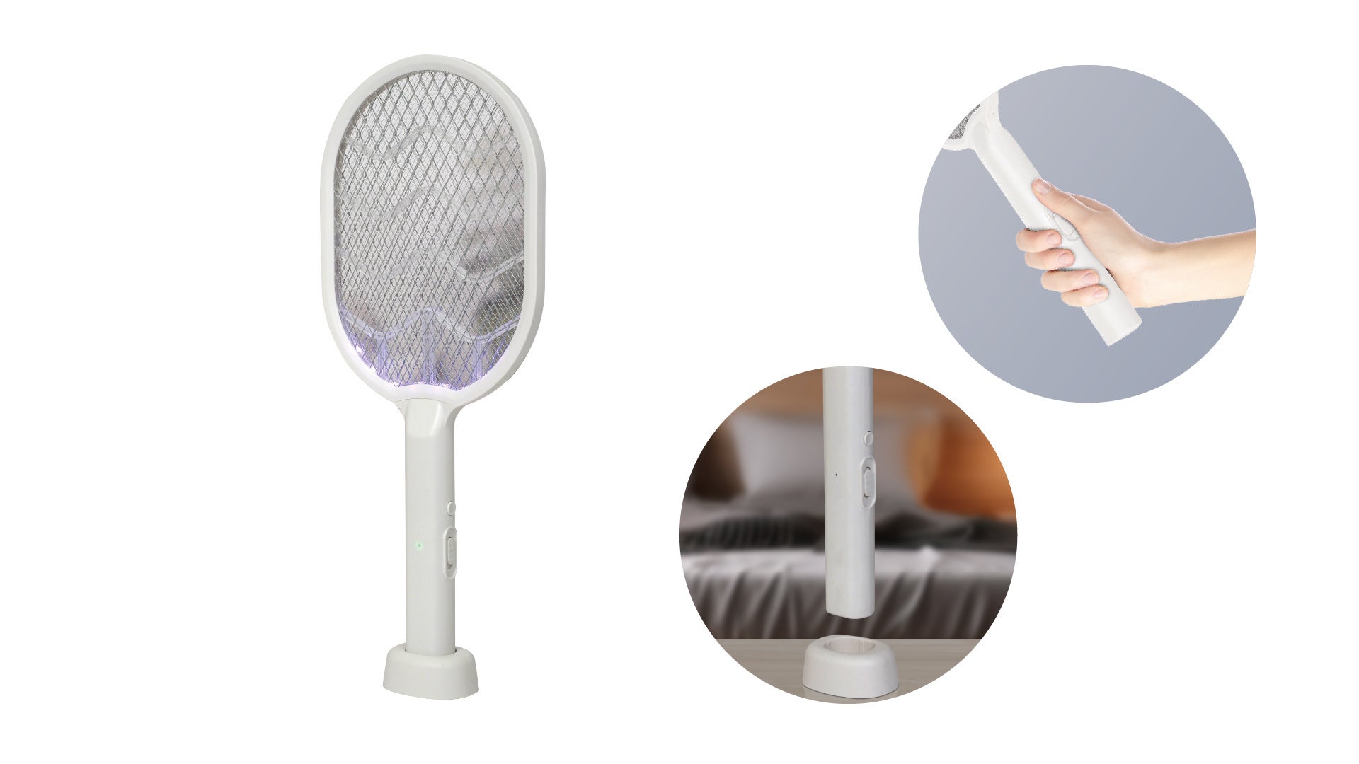 特徴:置いてもラケットとしても使える便利な電撃ラケット。使用時はスタンドから抜いてラケットモードをオン。あとは狙いを定め・・・「殺虫スマッシュ!」置き型モードでは本体のブルーライトが点灯して蚊や羽虫を誘導します。USB充電式で繰り返し使えて便利。