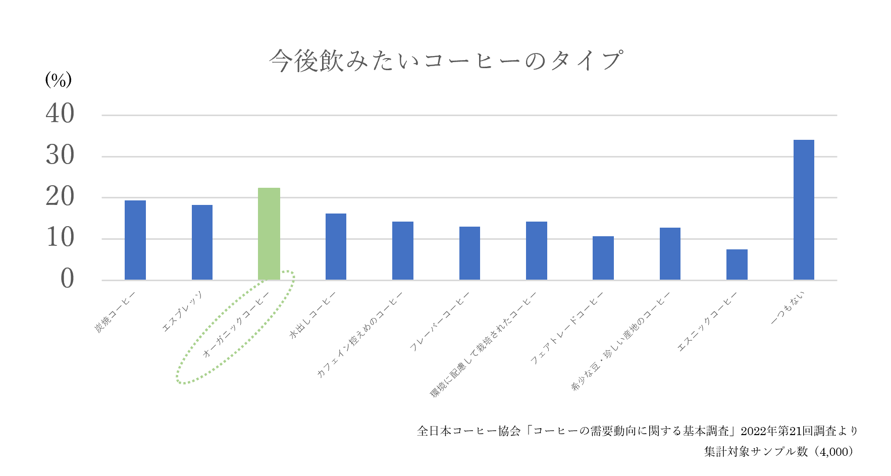今後飲みたいコーヒーのタイプでは、オーガニックコーヒーが最も高い結果となり、一般の方々によるエシカル商品への関心の高さが窺えます。