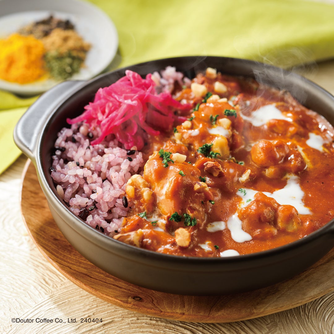 まろやかでクリーミーな味わいのバターチキンカレーです。具材には一口大のやわらかなチキンを入れています。散りばめたミックスナッツが香ばしさと食感のアクセントを加えています。色鮮やかなレッドキャベツとビーツのラペのシャキシャキとした食感と爽やかな酸味が味わいにコントラストをもたらし、最後の一口までおいしく食べられる一品です。