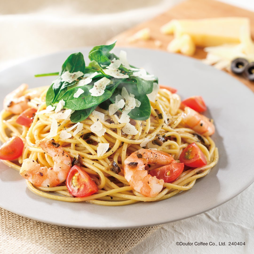 オリーブのほのかな甘みと魚介の旨味が絶妙に調和したパスタに、プリプリの海老と彩り鮮やかなサラダほうれん草を合わせました。ミニトマトのほのかな酸味が、深い味わいのパスタソースを軽やかにまとめています。さらに、薄削りのパルメザンチーズと一緒に食べることで、ミルキーでコク深い味わいも感じられる一皿です。