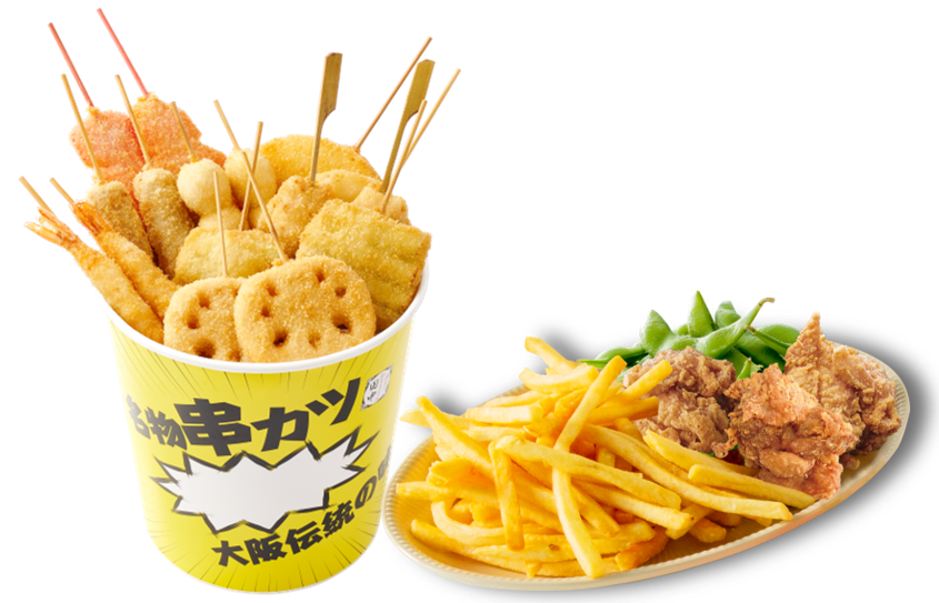 (串カツバケツシリーズ+990円で鶏もものから揚げ(5個)とポテトフライと枝豆がセット)