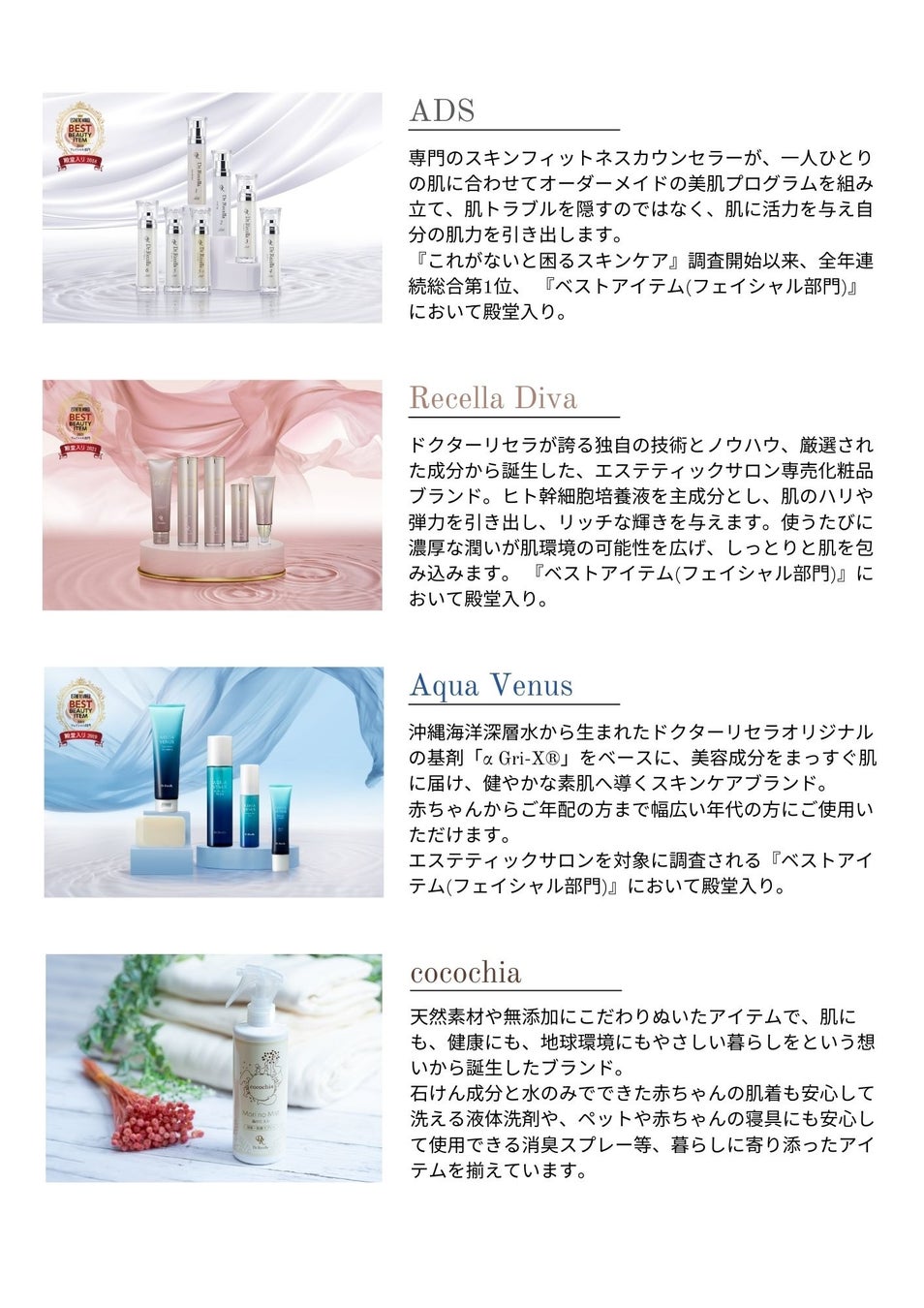 また、BEST BEAUTY ITEM フェイシャル部門では、「ADS」「Recella Diva」「アクアヴィーナス」が3年連続受賞で殿堂入りしました。