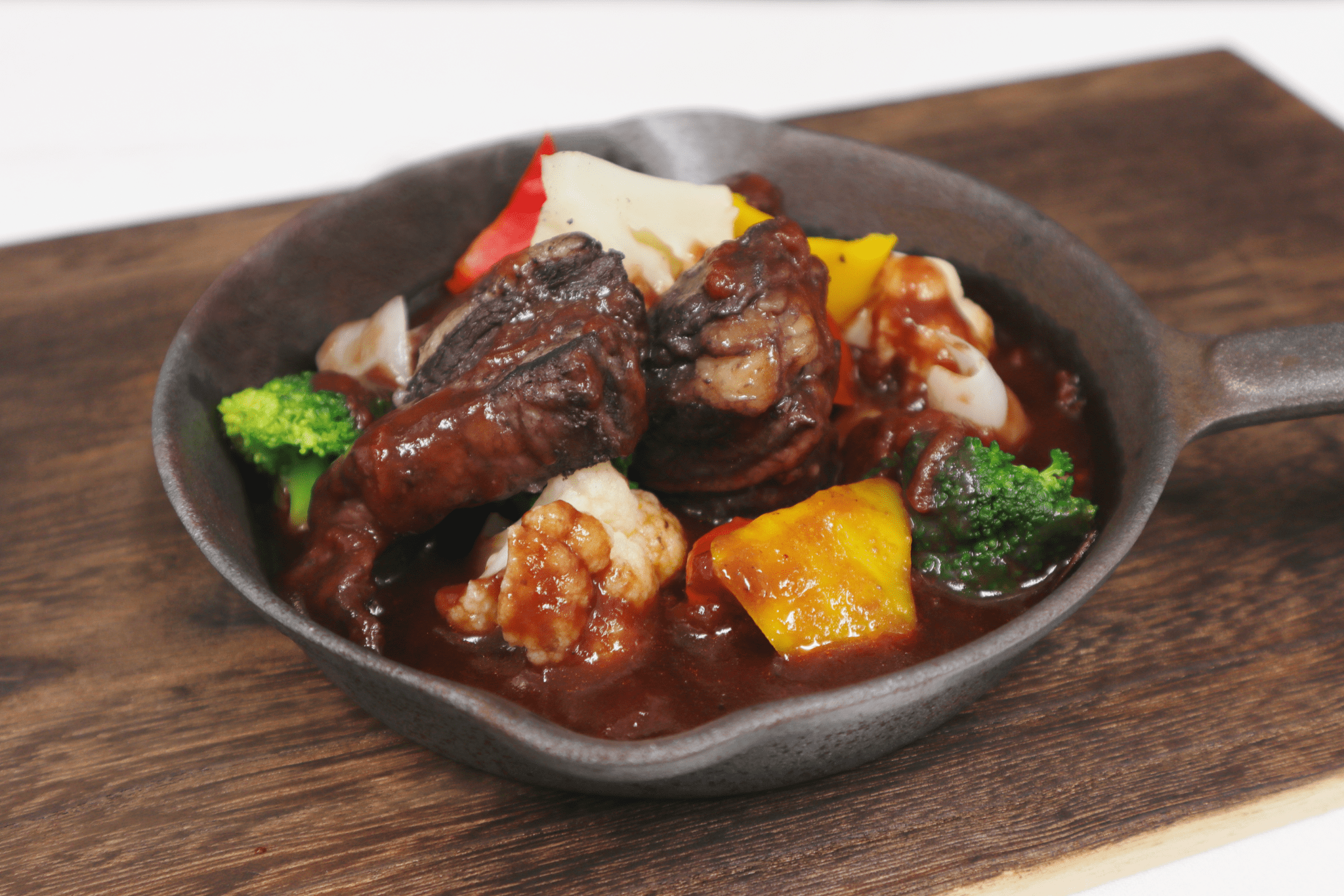 肉は丸1日赤ワインと香味野菜で漬け込み、4時間かけて柔らかく煮込みました。