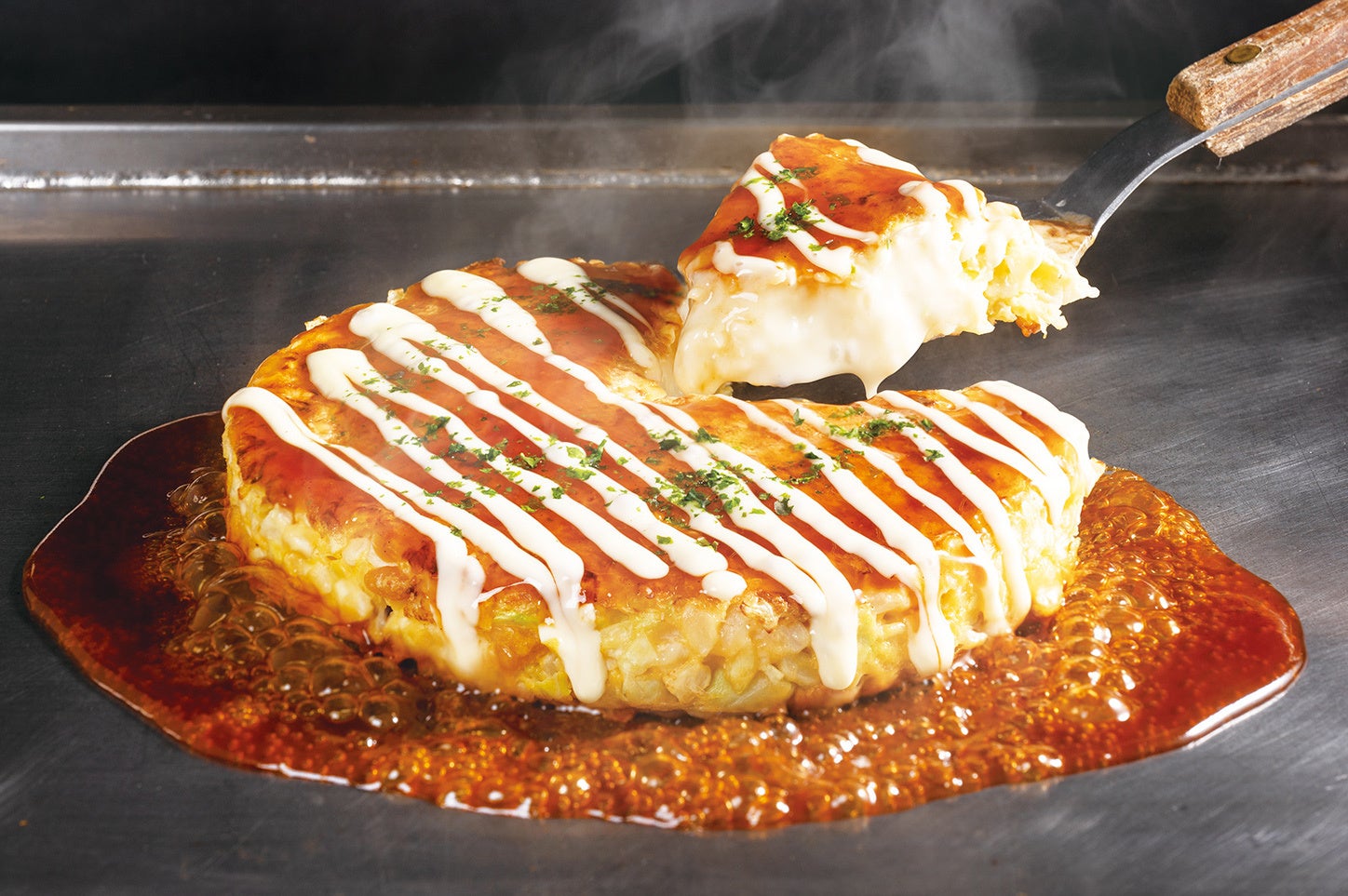 北海道産カマンベールチーズを豪快にまるごと1個包んで焼きあげた自慢のお好み焼き。