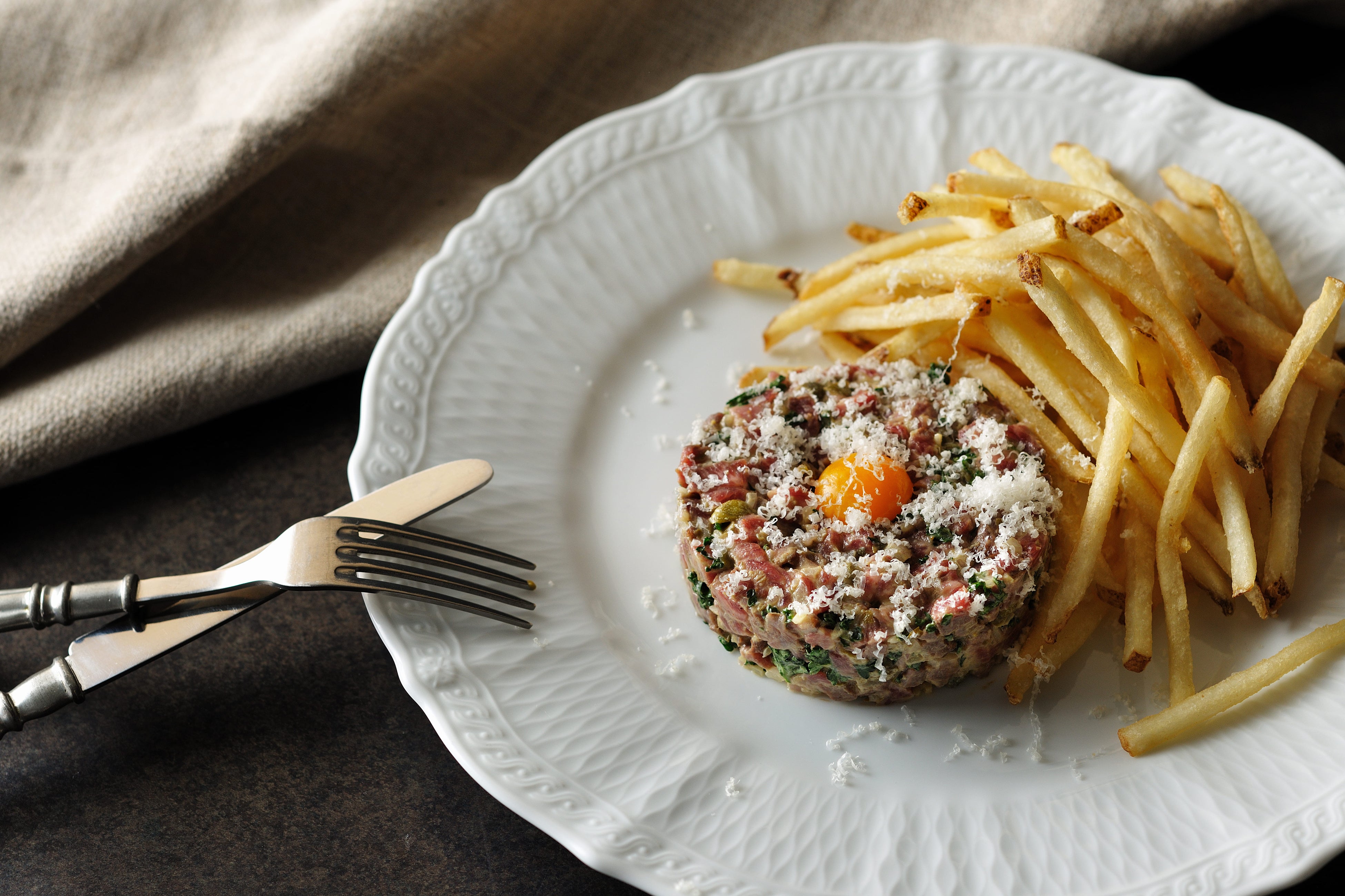 国産のうちもも肉をレアの状態でさまざまな野菜とスパイスで合わせたコクのあるタルタルステーキです。
