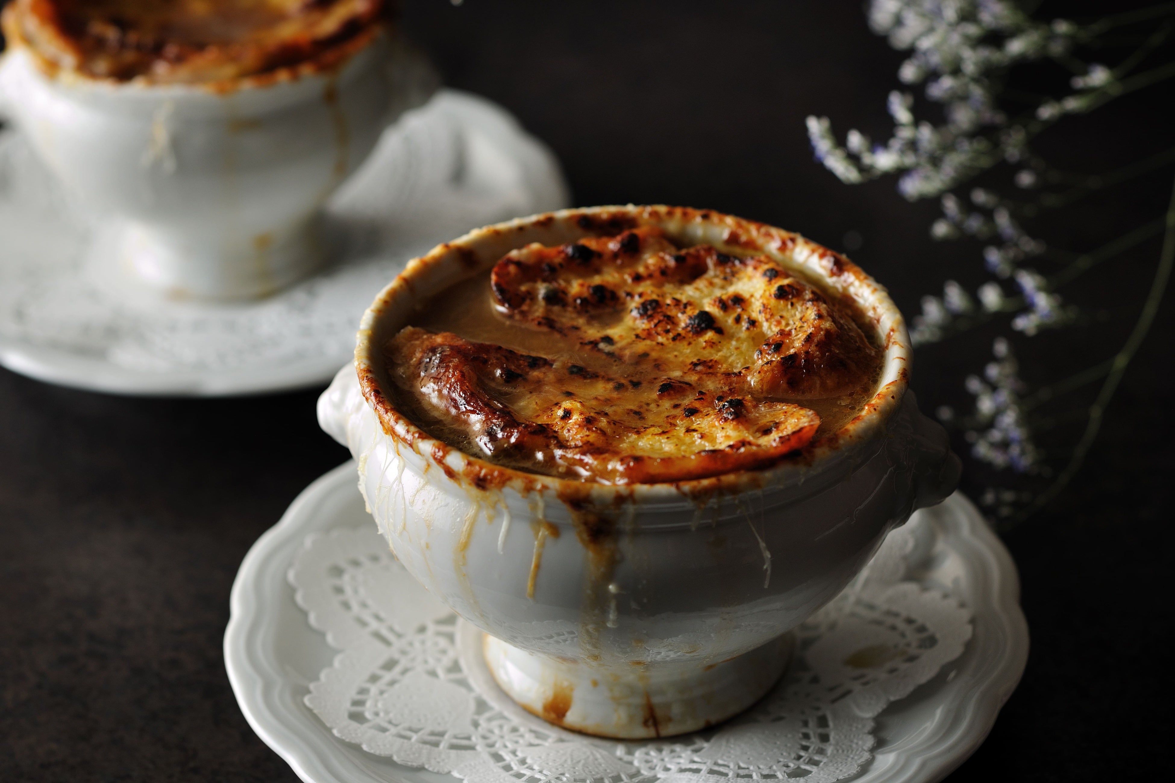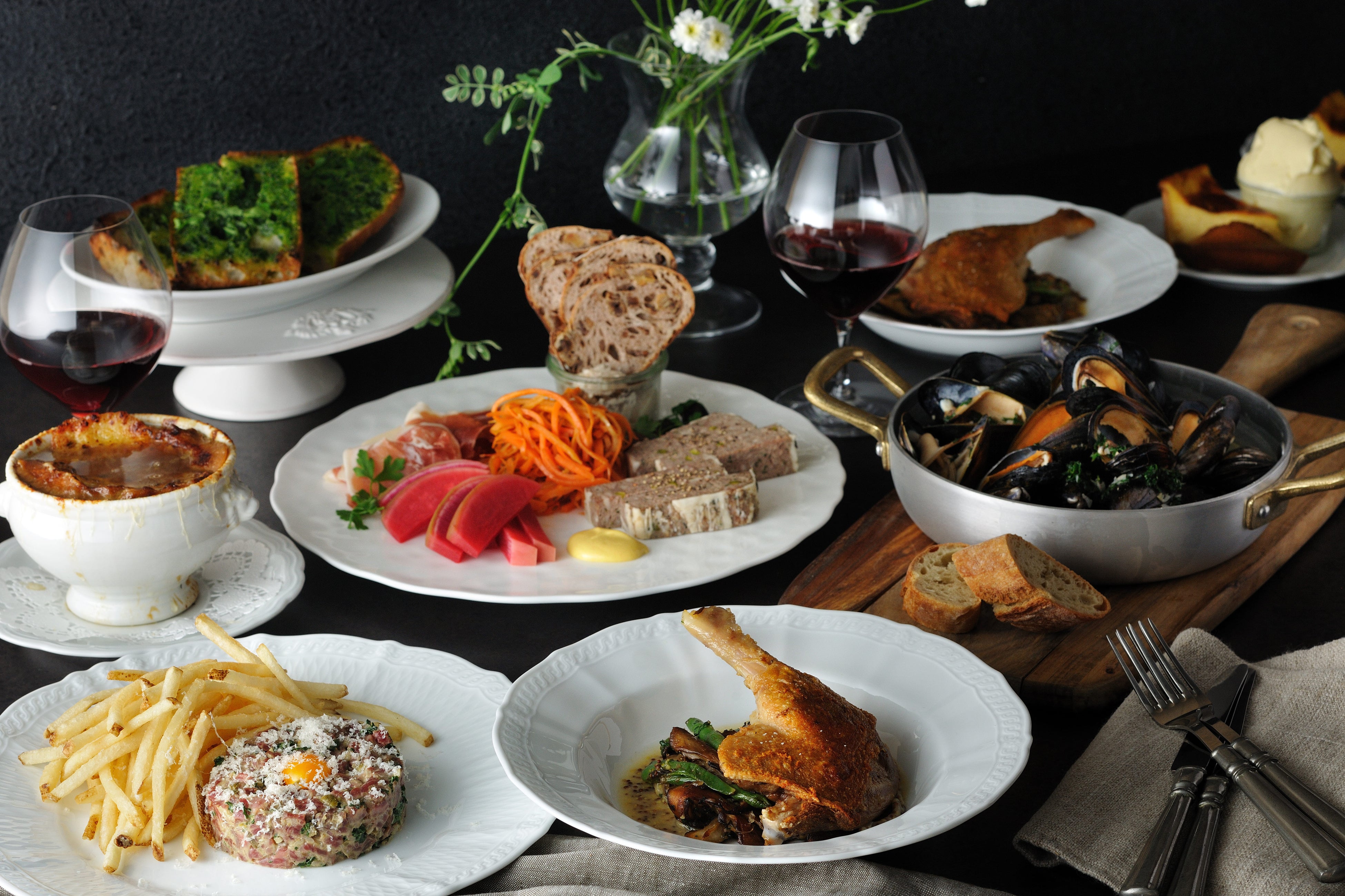 フレンチデリ4種盛り合わせの前菜から始まり、シグネチャーメニューのオニオングラタンスープ、牛タルタルステーキ、ムール貝とアサリの白ワイン蒸し、鴨肉コンフィのバターソテーなど、季節の食材を活かした全7皿のラインナップです。