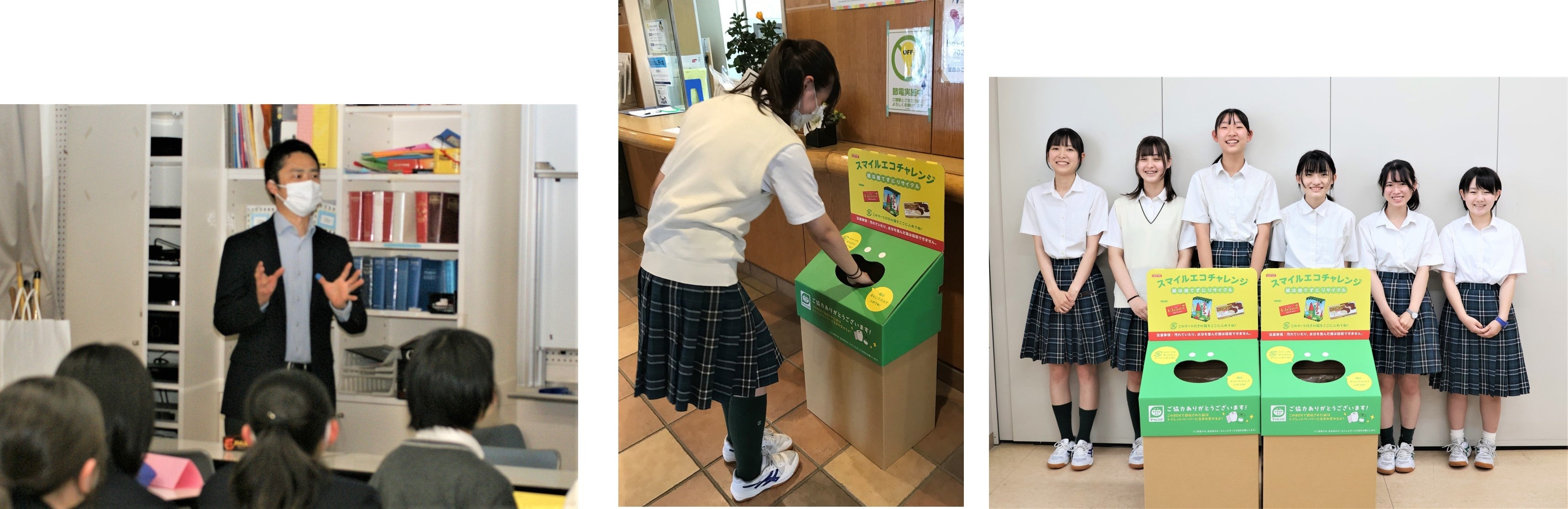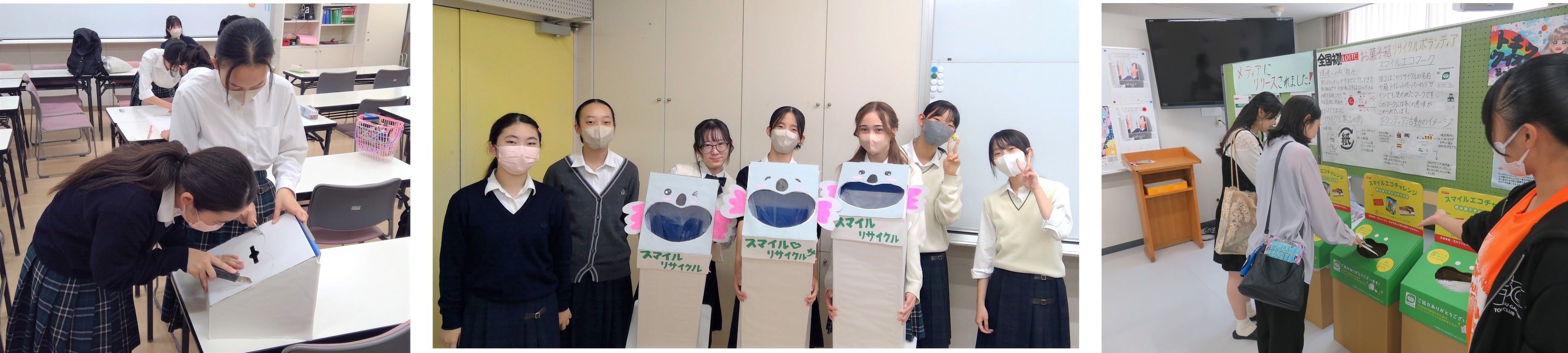 ②文化祭などの機会を通じて校外へも紙製容器包装を回収の取り組みと重要性をアピール(代表会議の皆さまが回収箱を自作・増設。画像:左、中)