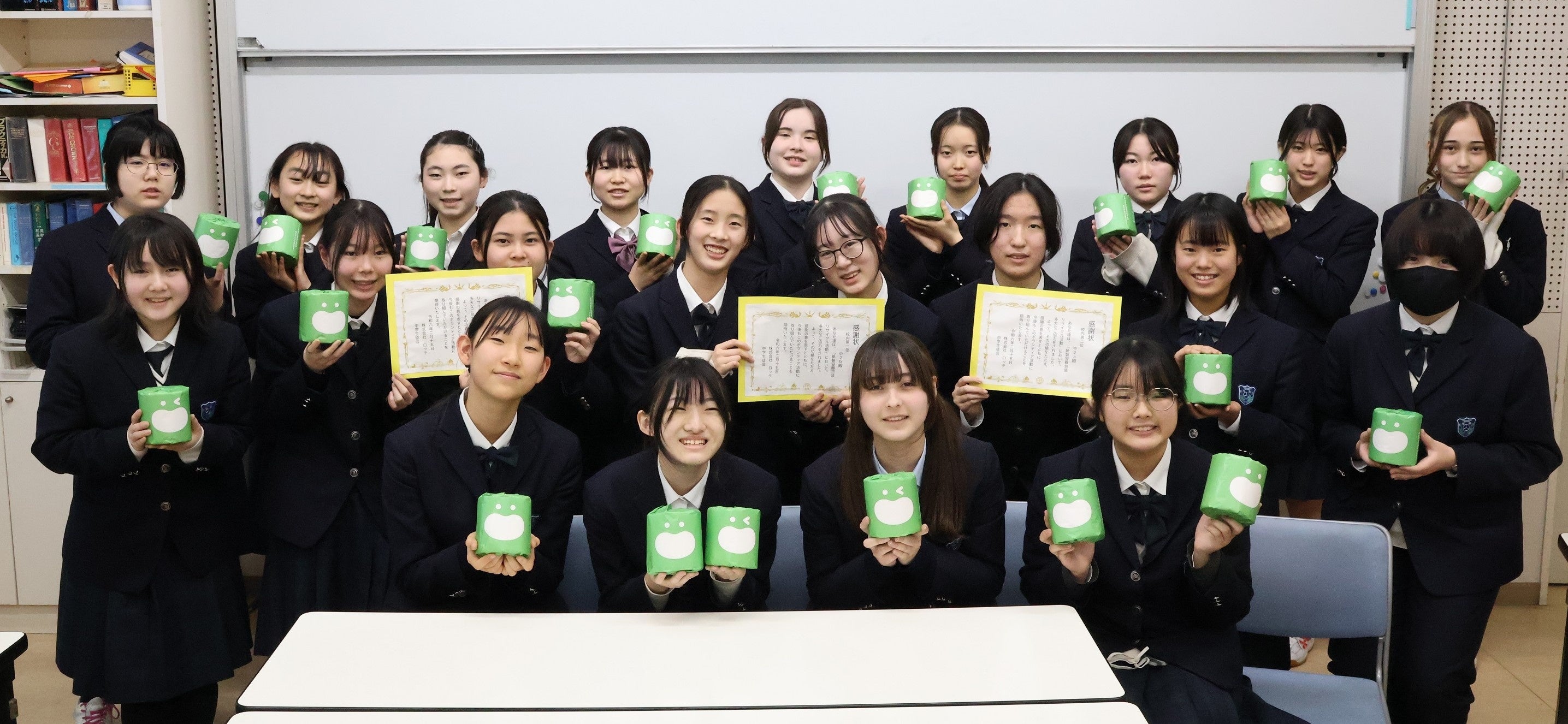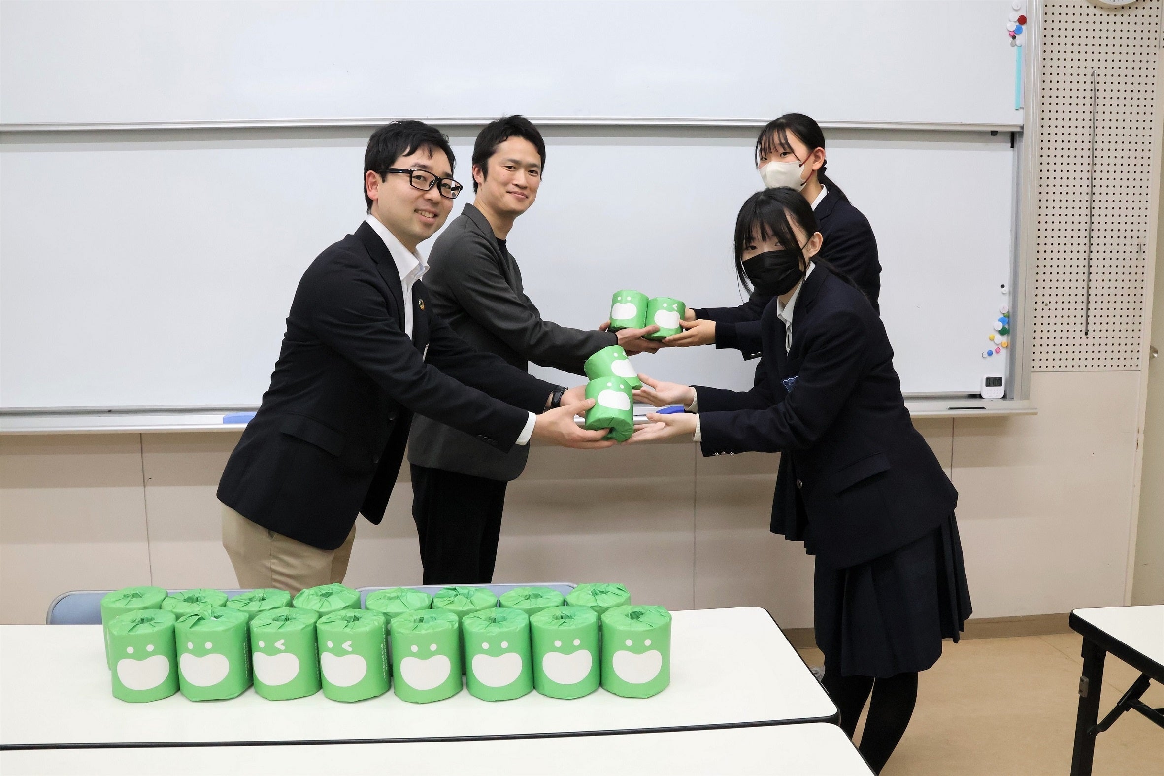 贈呈された「スマイルエコチャレンジ」特別デザインの再生トイレットペーパーを手にするトキワ松学園代表会議の皆さま