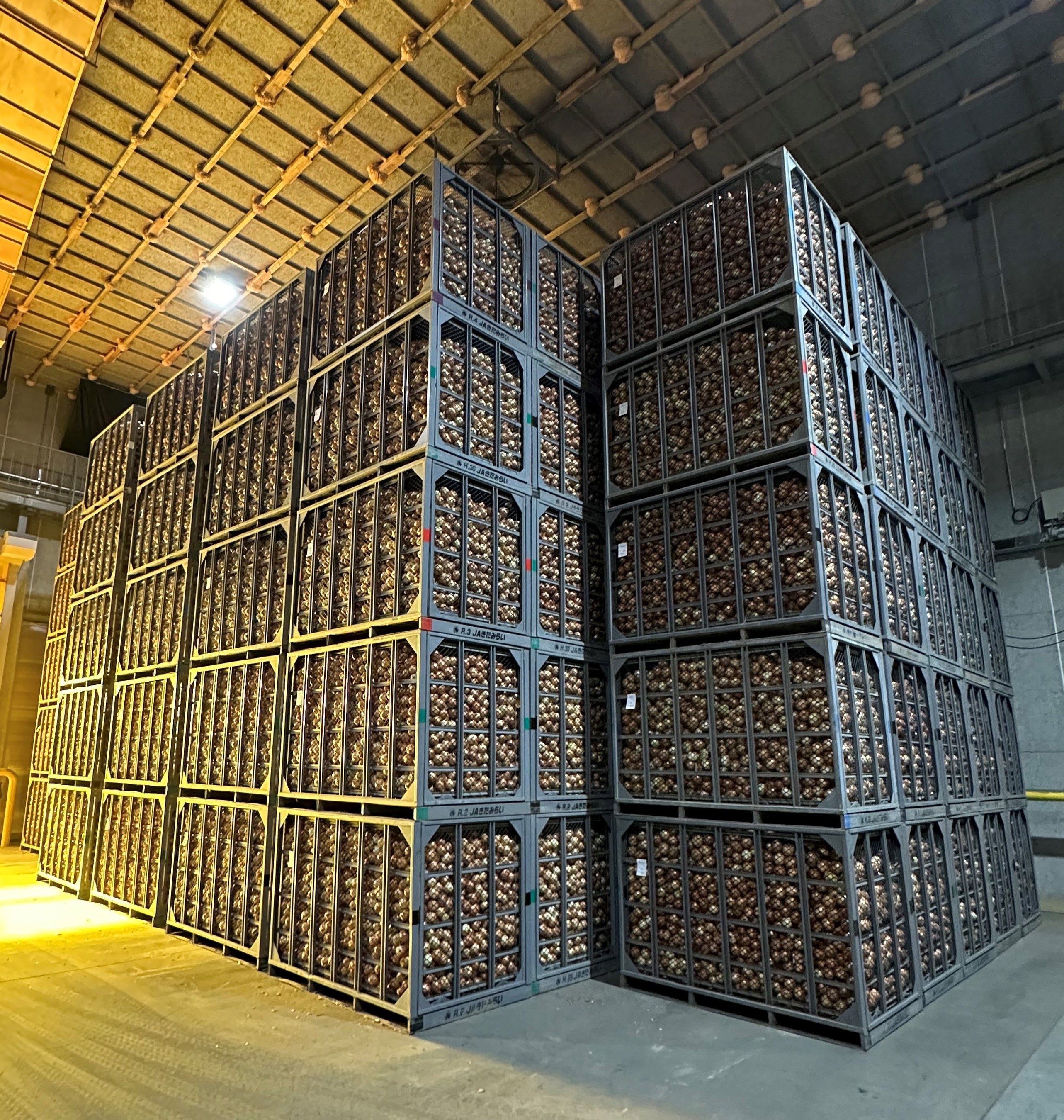 生産者が収穫したたまねぎは大型の鉄製コンテナ(通称「大コン」(読み:おおこん))に詰めて風乾され、その後、農協等の選果場に運び込まれます。主に使われている大コンは縦118cm×横179.5cm×高さ132.2cmで、重さは約120kg。約1.2tのたまねぎが収納できます。