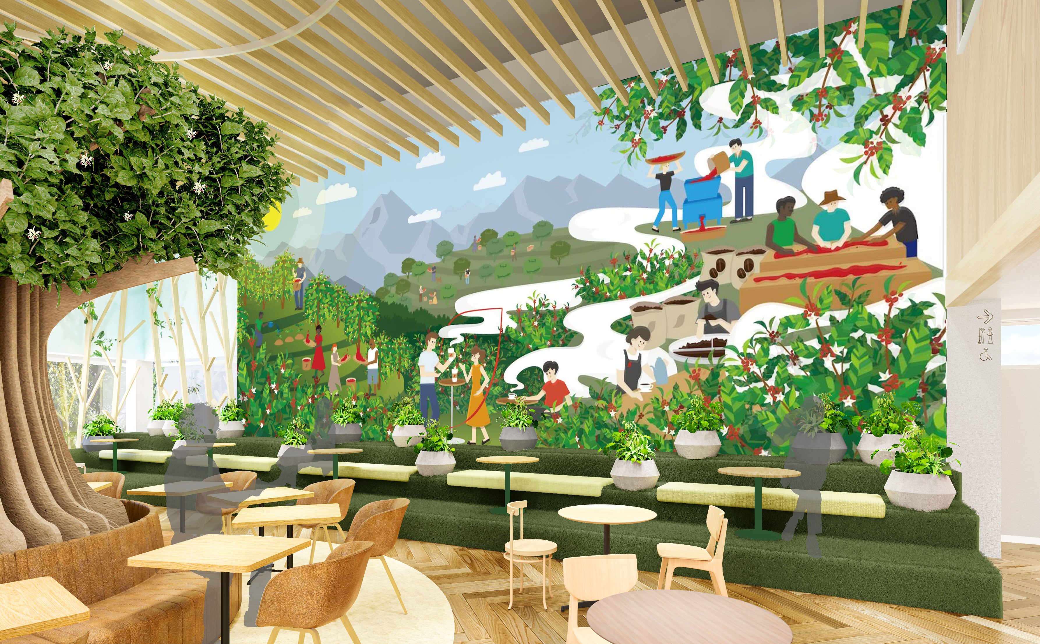 「Farm to cup(農園からカップまで)」のストーリーを描いた グラフィックを背面に施し、コーヒー生産地を想起させる階段席。