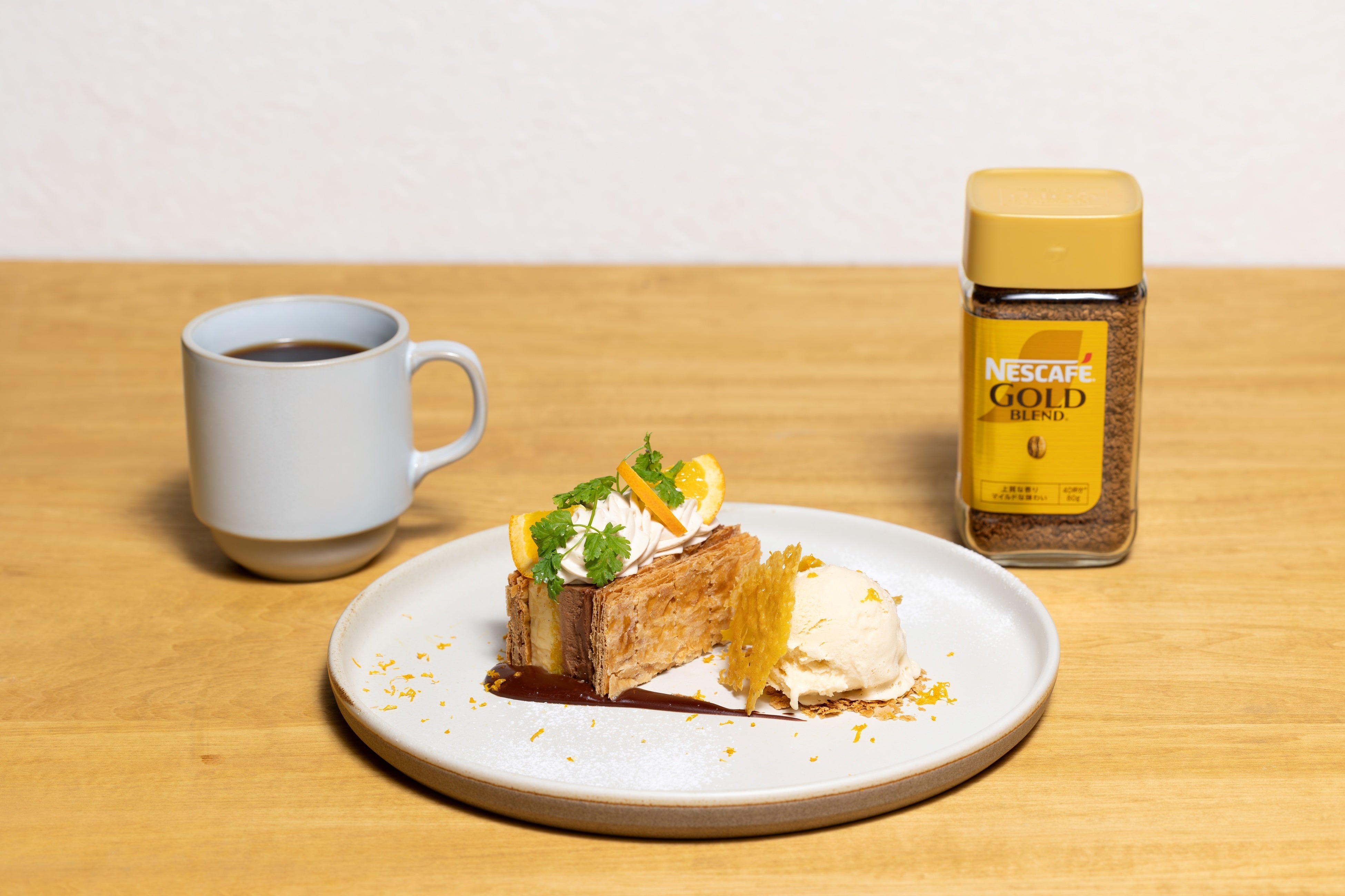 特長:オレンジのコンフィとカスタード風味のアイスをサンドしたチョコレート ムースのミルフィーユ。「ネスカフェ ゴールドブレンド」と一緒に楽しむとコーヒーを口に含んだ瞬間、上質な香りが広がり、澄み切った後味が、オレンジの甘さを一層引き立てる。