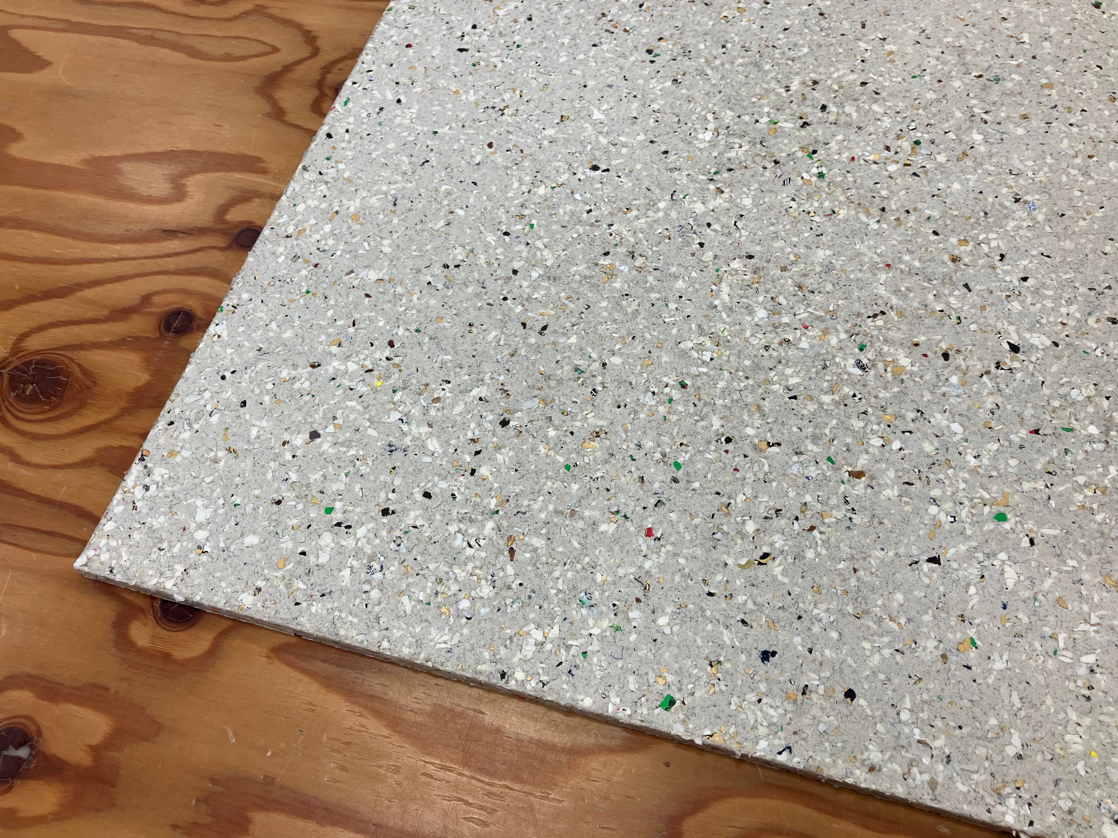 「ネスカフェ ゴールドブレンド エコ&システムパック」の 紙パッケージを使用し、アップサイクルしたテーブルの天板(上)とユニフォーム(下)